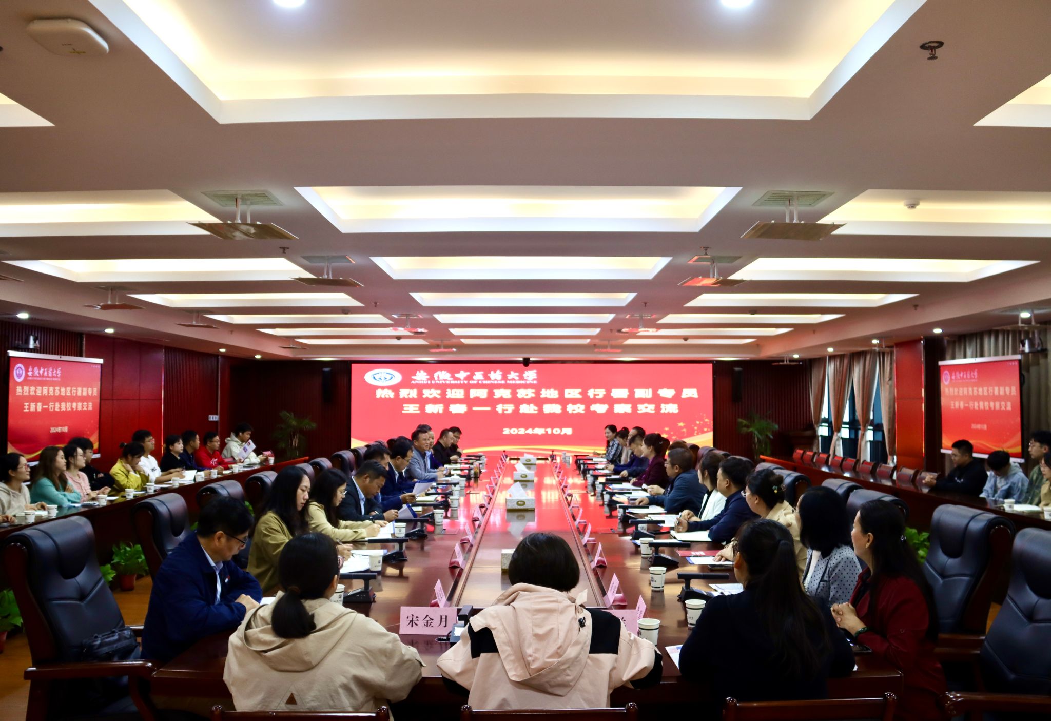 谢瑞瑾对王新春一行的到来表示热烈欢迎和衷心感谢,并从学科专业建设、人才培养、毕业生就业等方面介绍了学校的基本情况和特色优势。他指出,学校在事业发展过程中,与新疆地区的联系也日益紧密。党的十八大以来,新疆社会经济发展日新月异,阿克苏地区历史文化悠久,区位优势明显,是对接国家丝绸之路经济带、中巴经济走廊战略的重要一员,未来发展大有可期,希望与阿克苏地区加强交流,在人才培养、实习就业等领域开展深入合作。
