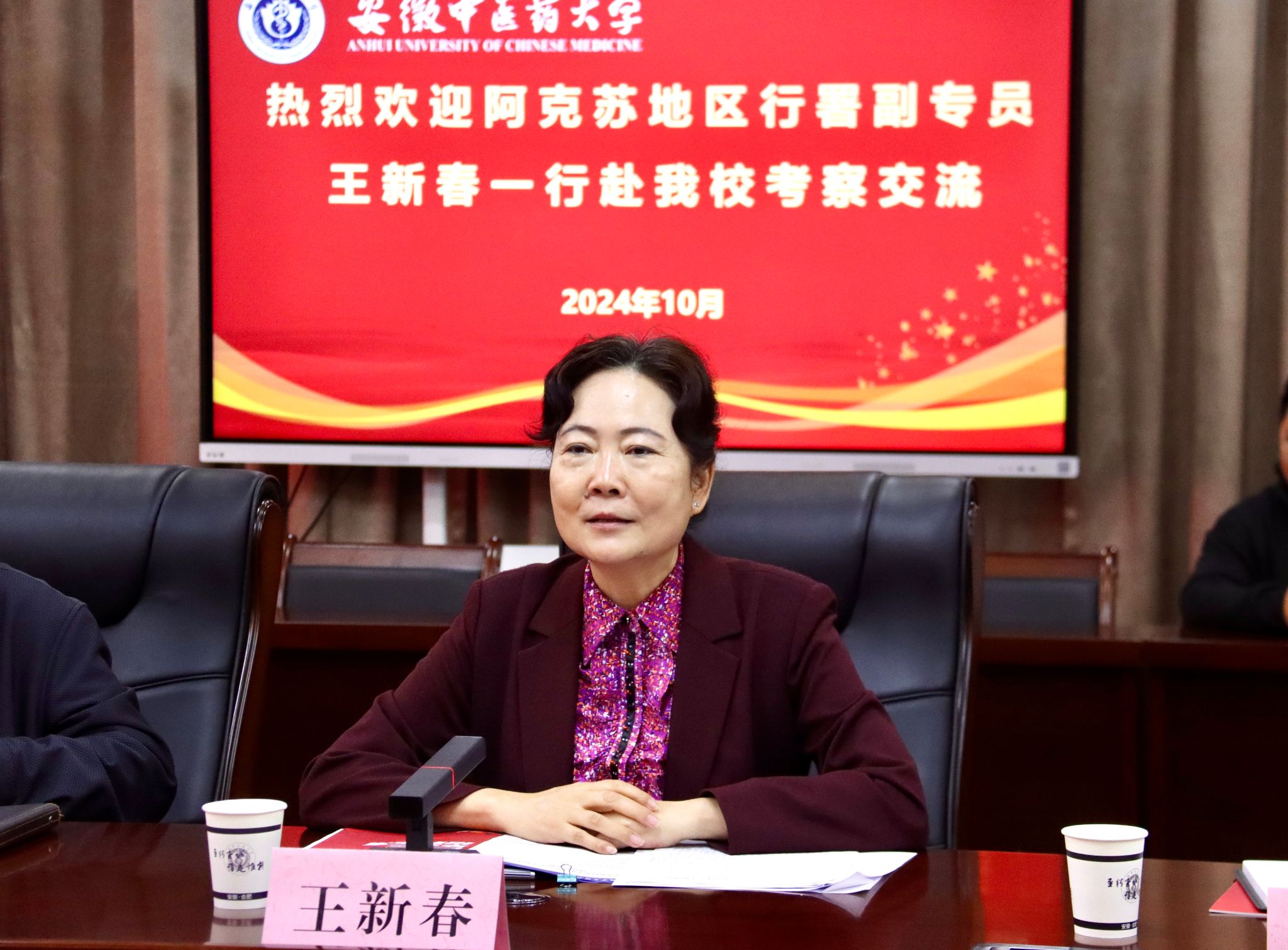 王新春对学校的热情接待表示诚挚感谢,对学校的高质量发展和“双一流”建设表示高度赞许。她介绍了阿克苏地区概况及一行来访人员,她指出,阿克苏地区社会经济健康发展,各医疗卫生单位当前急需众多医学人才,希望双方能进一步深入合作,欢迎毕业生前往阿克苏地区就业实践人生价值。阿克苏地区卫生健康委党委副书记、主任阿孜古丽·马木提同志介绍了阿克苏地区医疗高质量发展及此次招才引智活动等有关情况。