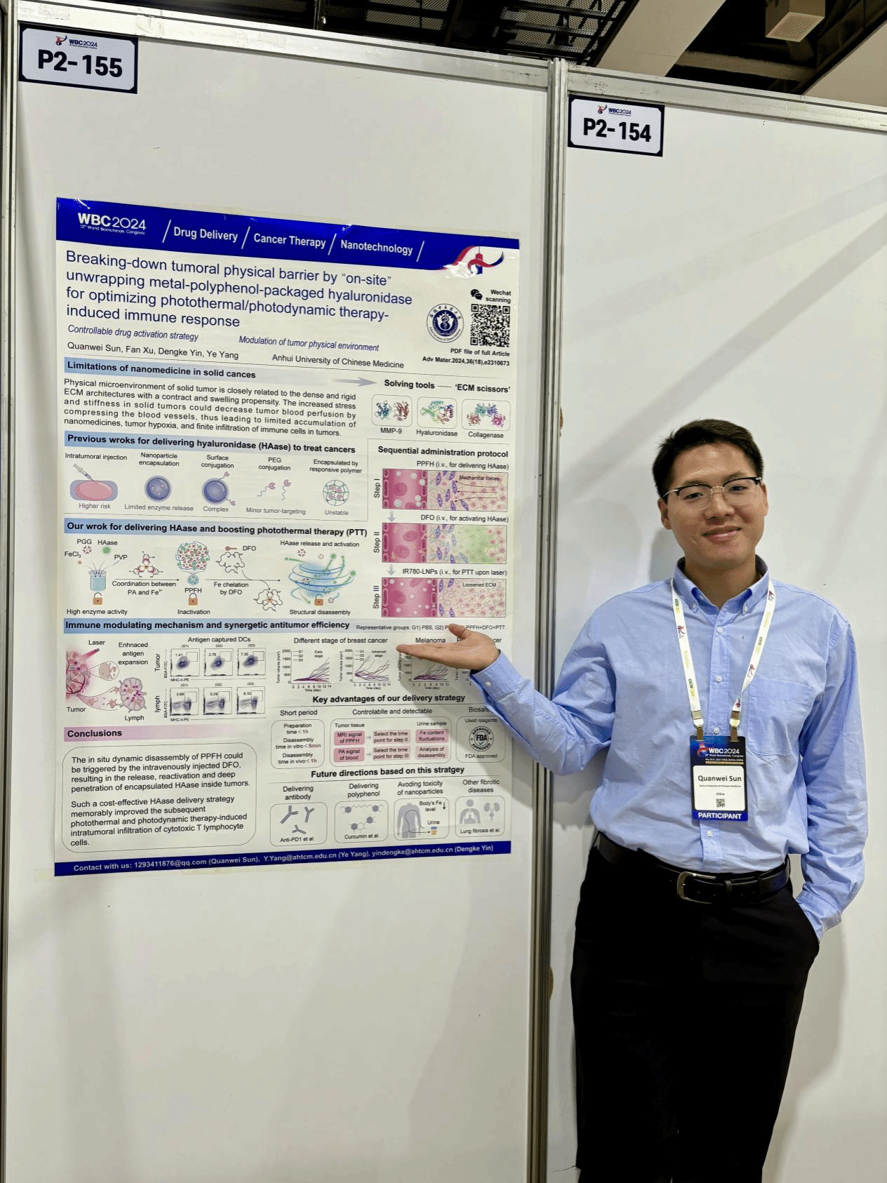 孙全威,男,汉族,共青团员,安徽中医药大学药学院2022级中药学专业博士研究生。截至目前,该生以第一作者在ACS Applied Materials & Interfaces、Biomaterials、Advanced Materials等材料科学权威期刊上发表5篇高水平研究论文。在专业学习、科研实践和学生工作中,展现了药院学子锐意进取的风采。硕士期间,该生作为负责人主持安徽省质量工程项目等。研一在尹登科教授的指导下发表了硕士期间的第一篇研究论文,获得硕博连读资格,师从杨晔教授继续开展系统且深入的研究。2022年至2024年接连在Applied Materials & Interfaces、Biomaterials以及Advanced Materials上发表高水平研究论文,其中一篇论文单篇影响因子高达29.4分。该生以乐观、积极、认真的态度对待每一件事,在磨砺中成长,逐渐成长为一名素质过硬的博士生。