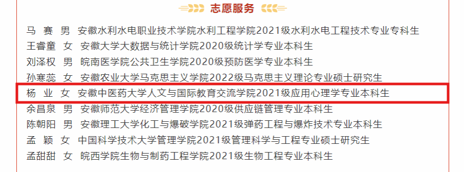 杨业,女,汉族,中共预备党员,安徽中医药大学人文与国际教育交流学院2021级应用心理学专业本科生。担任校华佗爱心社负责人、三下乡实践团队队长。她热心公益,学以致用,立足专业组织开展志愿活动130余次,服务时长760余小时,服务人群5000余人次。她注重基层调研,紧扣群众痛点需求,凝练打造志愿服务项目品牌,项目曾获第六届全国青年志愿服务大赛银奖、第七届安徽省青年志愿服务项目大赛金奖、防艾公益项目全国100强。带领的团队获评全国示范性团队、省级优秀实践团队等荣誉国家级8项,省级4项,区级3项。她个人获大学生自强之星、优秀志愿者等荣誉,受央视新闻、人民日报、中国青年网等多家主流媒体宣传报道。(校团委/文图 彭程/审核)