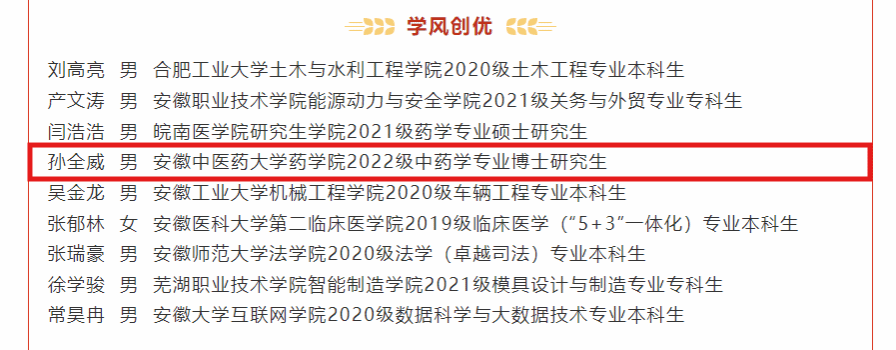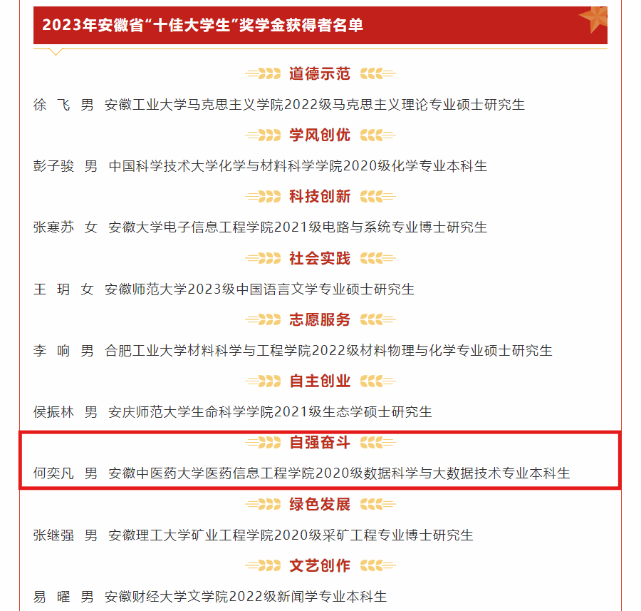 日前,2023年度安徽省“十佳百优”大学生奖学金获得者名单公布。经学校推荐、专家评审团推荐、网络风采展示、特邀评审团推荐等环节,我校医药信息工程学院何奕凡获得自强奋斗类2023年安徽省“十佳大学生”奖学金,药学院孙全威和人文与国际教育交流学院杨业分别获得学风创优类、志愿服务类2023年安徽省“百优大学生”奖学金。