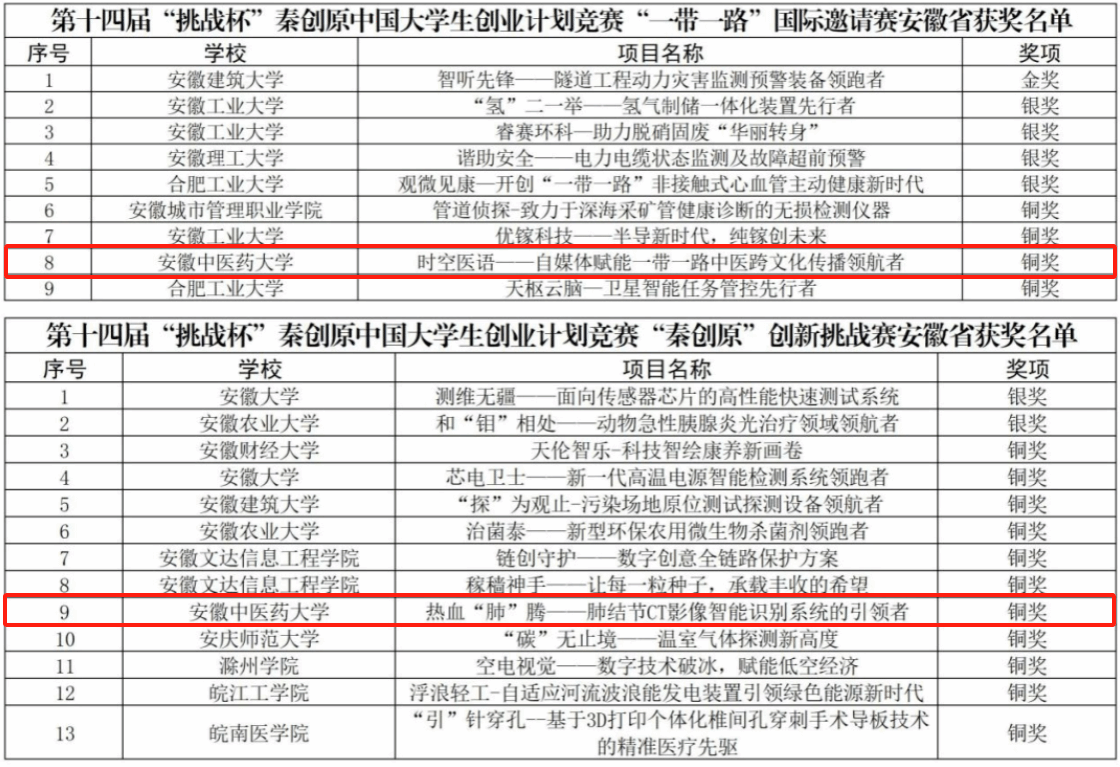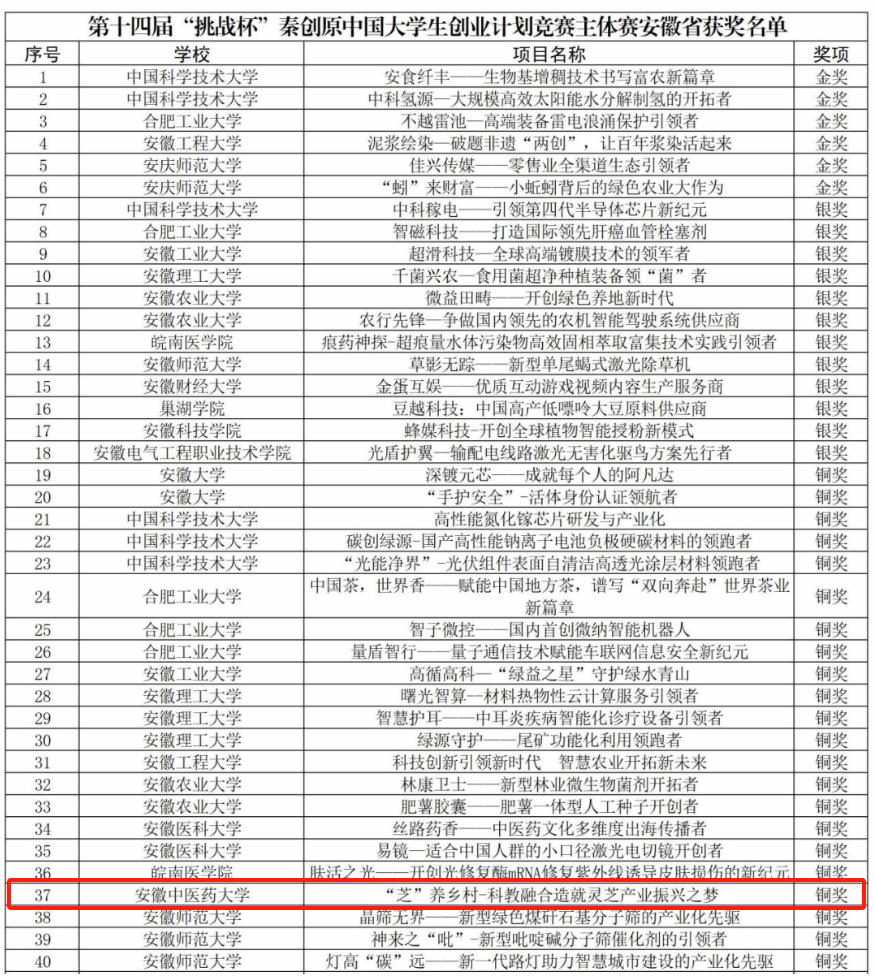 经过校级初赛、省级复赛,共有来自412所国内高校,14所国际高校的839个项目进入全国决赛终评。经过激烈角逐,在主体赛中,我校药学院作品《“芝”养乡村-科教融合造就灵芝产业振兴之梦》获得铜奖;在“一带一路”国际邀请赛中,第一临床医学院作品《时空医语——自媒体赋能一带一路中医跨文化传播领航者》获得铜奖;在“秦创原”创新挑战赛中,中西医结合学院作品《热血“肺”腾——肺结节CT影像智能识别系统的引领者》获得铜奖。
