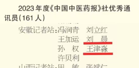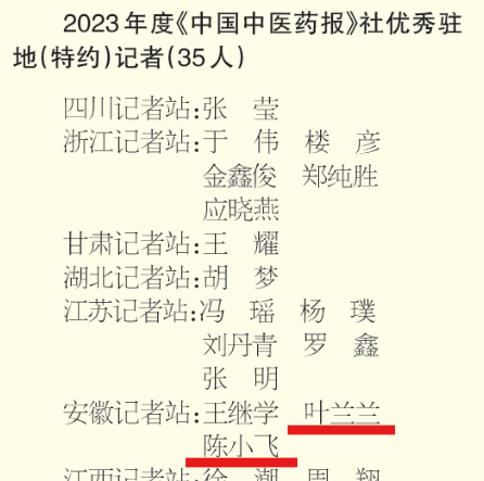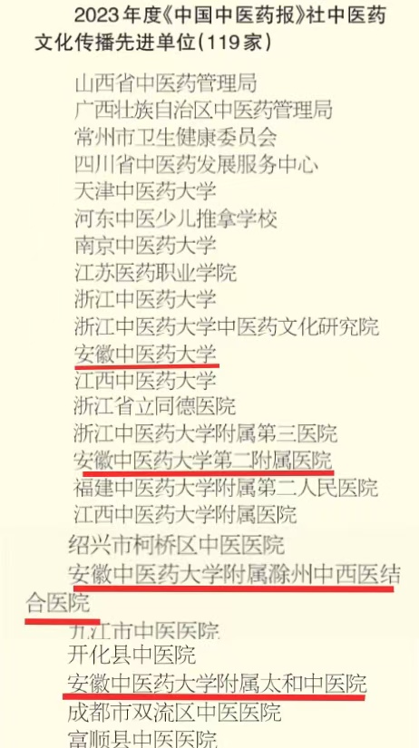 学校以及第二附属医院、附属滁州中西医结合医院、附属太和中医院分别荣获 2023 年度《中国中医药报》社中医药文化传播先进单位;叶兰兰、陈小飞获评优秀驻地(特约)记者;王津淼、刘晨获评优秀通讯员。