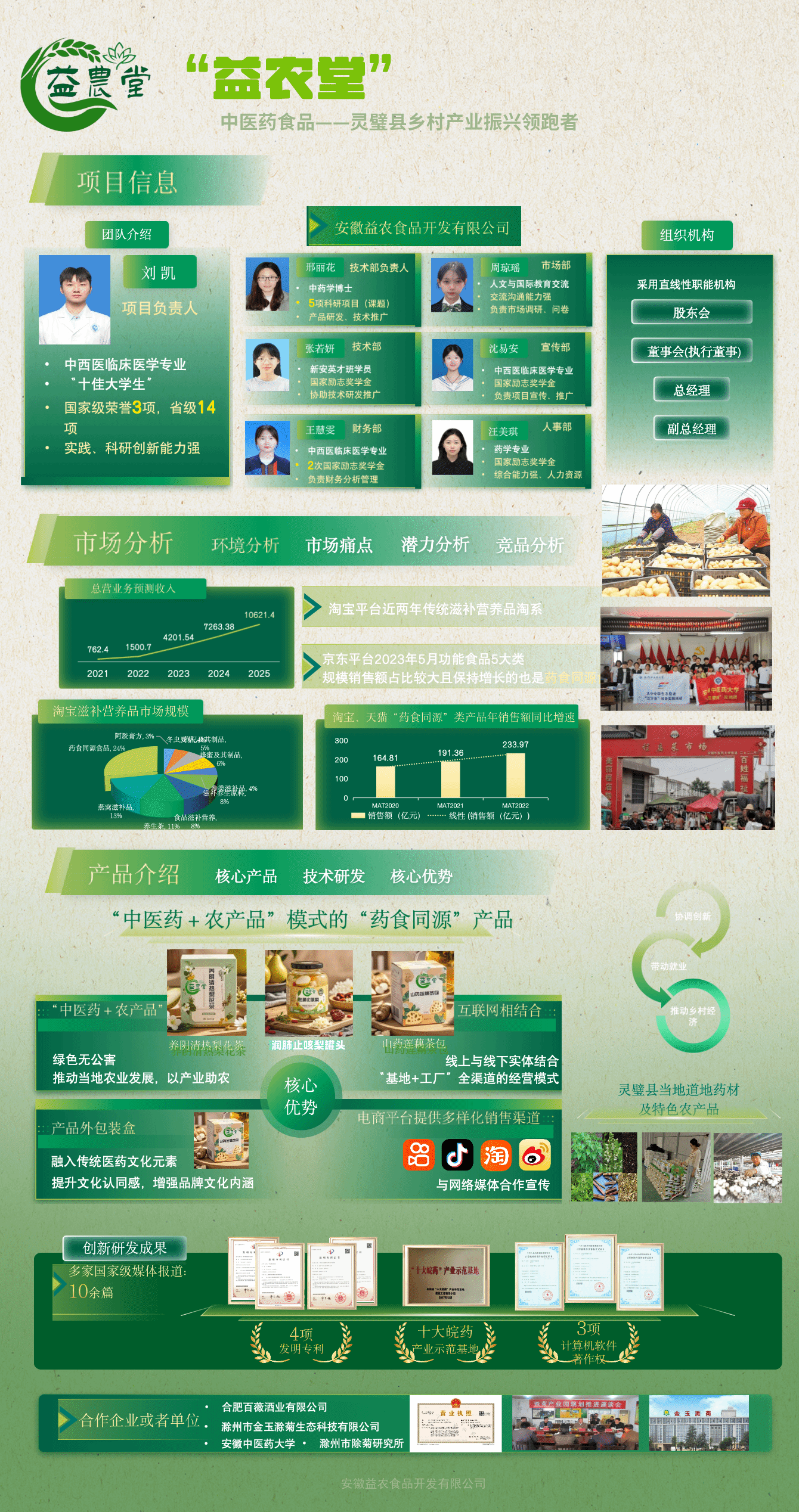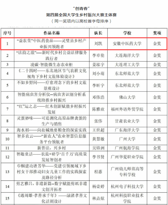 近日,“创青春”第四届全国大学生乡村振兴大赛决赛评审会在浙江同济科技职业学院顺利举行。我校药学院作品《“益农堂”中医药食品——灵璧县乡村产业振兴领跑者》(队长:刘凯 指导教师:俞年军、沈同平)荣获大赛金奖。