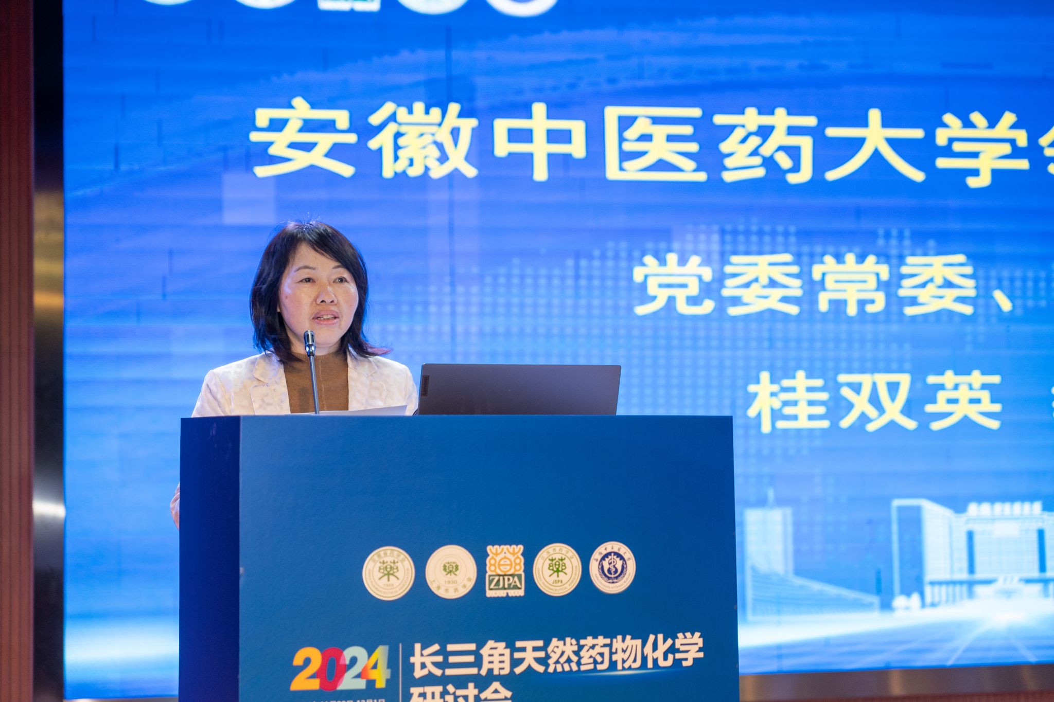桂双英代表学校对与会嘉宾表示热烈欢迎和诚挚感谢。她指出,本次研讨会专家云集,交流学术思想和研究成果,将有力加强长三角地区中药天然药学科的交流与合作,协同推进长三角中医药一体化高质量发展。