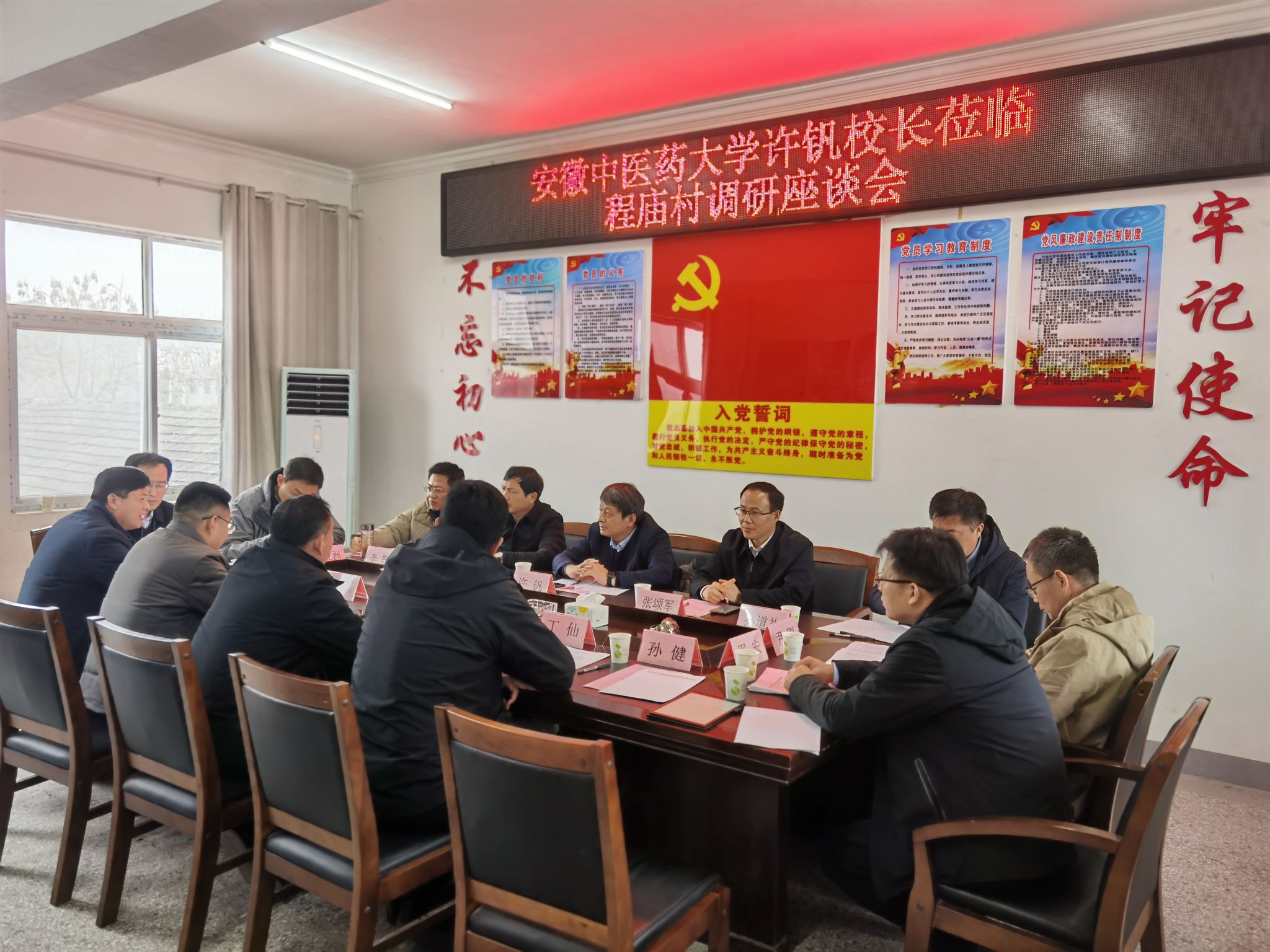 许钒听取了学校驻村工作汇报,详细了解了程庙村的各项帮扶工作后,向灵璧县委、县政府对驻村干部的关心和支持表示感谢,他指出,学校一直高度重视帮扶工作,驻村帮扶是巩固拓展脱贫攻坚成果与全面推进乡村振兴有效衔接的重要举措,学校会继续围绕“五大振兴”和乡村所需,在基层党建、产业发展、基础设施建设、公共服务等方面落实精准帮扶任务;依托学校在中医药领域优势,紧密结合程庙村资源、特色产业,在现有的基础上迭代升级,发展壮大村级集体经济;通过提升当地中医诊疗水平、加大教学实习倾斜、合作开发新产品等方式,进一步深化校地合作。