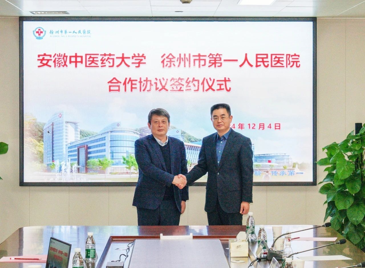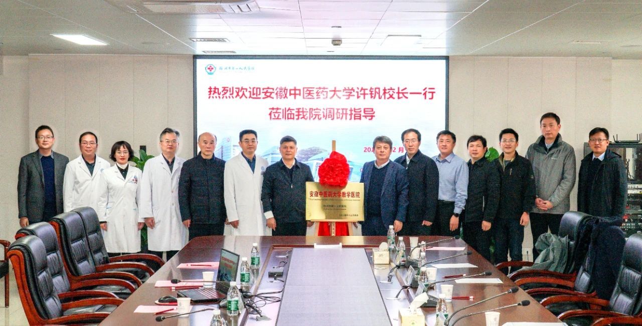 12月4日,我校与徐州市第一人民医院合作协议签约仪式和学校教学医院揭牌仪式在徐州举行。学校党委副书记、校长许钒,徐州市卫生健康委员会党委书记、主任黄广振,徐州市第一人民医院党委书记丁继存,校院双方有关部门负责同志出席。丁继存与许钒签订了“安徽中医药大学与徐州市第一人民医院合作协议”,黄广振与许钒共同为“安徽中医药大学教学医院”揭牌。仪式由徐州市第一人民医院党委副书记刘峰主持。