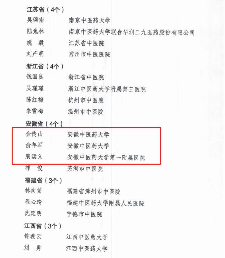 11月29日,国家中医药管理局公布了2024年全国老药工传承工作室建设项目名单,来自全国各省市区共计158个建设项目获批,其中安徽省获批四项,我校药学院金传山教授、俞年军教授、第一附属医院朋汤义主任三项工作室建设项目入选。