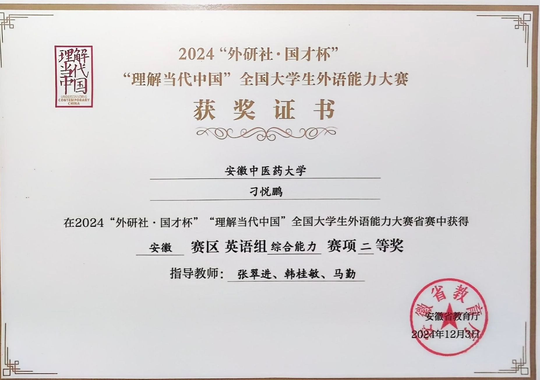 我校学子在指导老师的悉心指导下,认真准备,出色发挥,取得了优异成绩。第一临床医学院的刁悦鹏同学获得综合能力组二等奖和笔译项目三等奖;人文与国际教育交流学院陈凯丽同学、中西医结合学院王亦含同学获得英语演讲比赛三等奖;短视频组3个团队斩获三等奖,充分展示了我校大学生良好的综合素质和出色的英语应用能力。