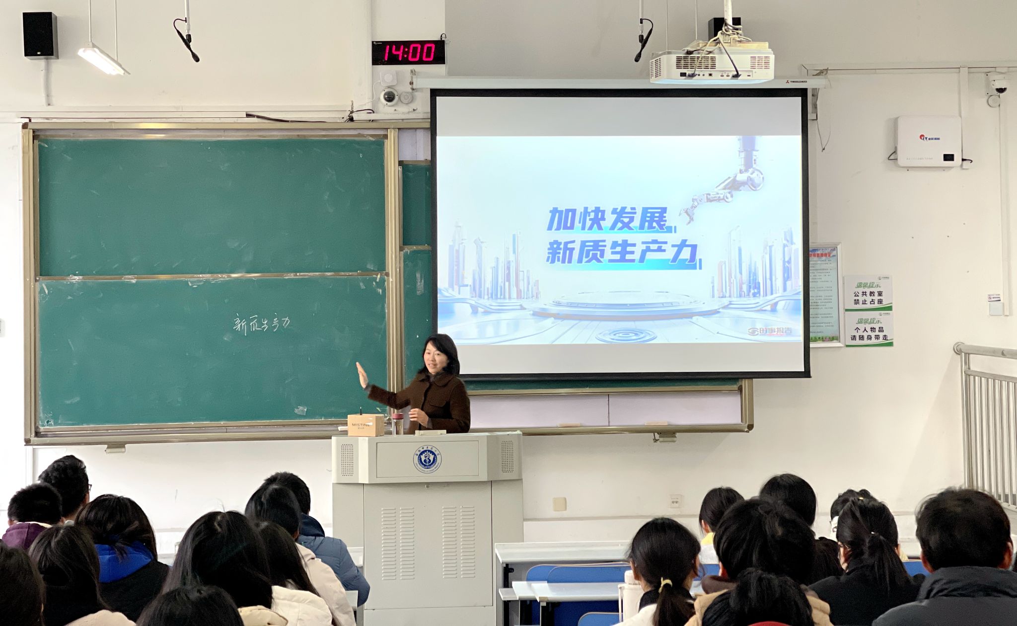 11月26日、28日,学校党委副书记、校长许钒以《加快发展新质生产力》为主题,先后为医药信息工程学院2024级计算机科学与技术专业、药学院2024级药学专业学生讲授“形势与政策”课。他运用大量的案例,旁征博引,结合学生专业,从学科交叉的角度,向同学们介绍了新质生产力提出的背景、新质生产力的特点及新时代加快发展新质生产力的意义。他指出,新质生产力的核心是技术创新,新质生产力是推动经济社会发展的关键力量。学校将积极推动教育、科研、人才有效贯通、融合发展,打造构建与新质生产力相匹配的新型教师队伍,培育造就与新质生产力相匹配的高素质人才。他勉励同学们要扎实学好专业知识技能,密切关注新质生产力的发展趋势,了解数字化、网络化、智能化融合带来的新机遇,充分利用学校各种资源培养自己创新思维能力,不负青春,不负韶华,在国家经济高质量发展进程中贡献自己的力量。