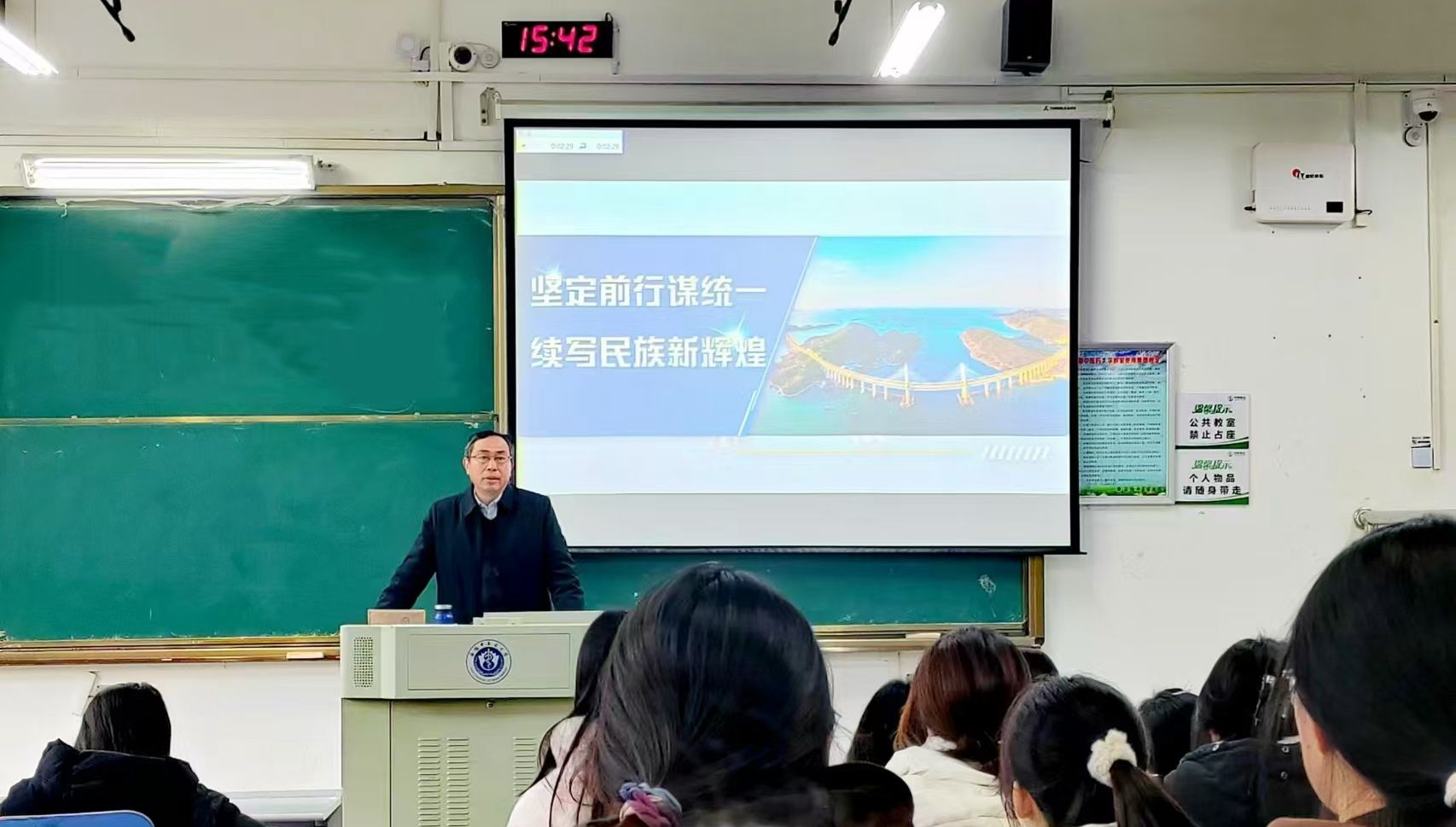 11月26日,学校党委常委、纪委书记、省监委驻校监察专员石金明为人文与国际教育交流学院2024级应用心理学与2024级汉语国际教育专业学生讲授《坚定前行谋统一 续写民族新辉煌》专题“形势与政策”课。他从立足长远把握两岸关系大局、“台独”分裂图谋注定失败、坚定不移推进祖国统一进程三个方面进行系统讲解,授课内容聚焦当下时事热点,引用鲜明事例,启发学生思考。最后,石金明强调,两岸同胞都是民族复兴的参与者、推动者、获益者,应当把握大势、秉持大义,把民族命运牢牢掌握在中国人自己手中,担负起时代赋予的使命和责任,为推进祖国统一进程贡献力量,为实现中华民族伟大复兴拼搏奋斗。