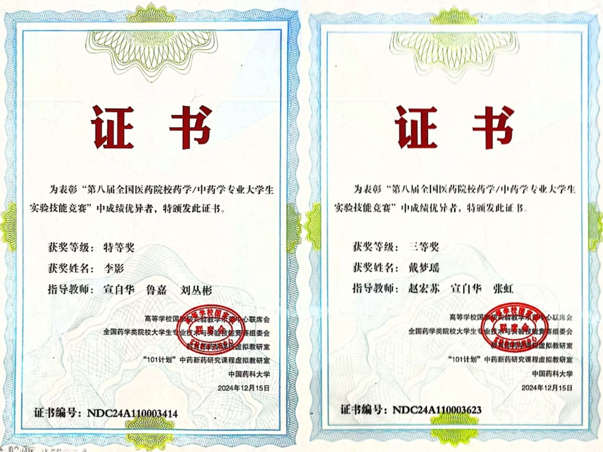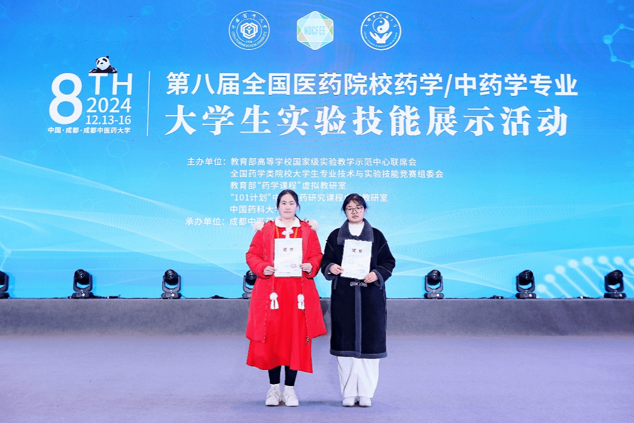 为推动药学/中药学人才培养模式改革创新,提高学生实验操作技能和实践动手能力,12月14-15日,由教育部高等学校国家级实验教学示范中心联席会、全国药学类院校大学生专业技术与实验技能竞赛组委会、教育部“药学课程”虚拟教研室、“101计划”中药新药研究课程虚拟教研室和中国药科大学主办,成都中医药大学承办的“第八届全国医药院校药学/中药学专业大学生实验技能展示活动”在成都中医药大学举行。我校21级药学专业李影获得特等奖、21级中药学专业戴梦瑶获得三等奖。