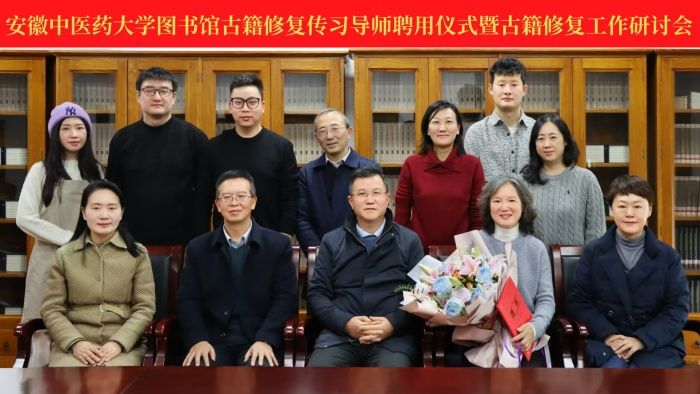12月16日上午,校图书馆举办古籍修复传习导师聘用仪式暨古籍修复工作研讨会,聘请国家级古籍修复师肖晓梅为图书馆古籍修复传习导师。校党委常委、机关党委书记、巡察办主任罗绍明,安徽省高等学校图书情报工作委员会秘书长、安徽大学图书馆馆长储节旺,安徽医科大学图书馆馆长张磊,合肥师范学院图书馆馆长方孝玲及图书馆相关人员参加了本次聘用仪式并就我校图书馆古籍修复的下一步工作进行了深入研讨。