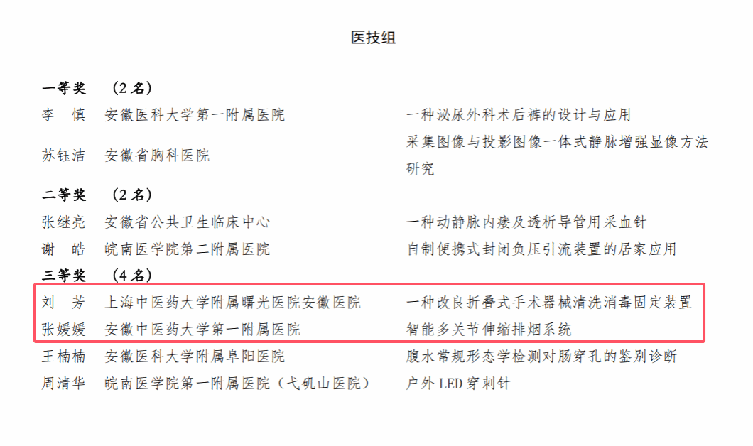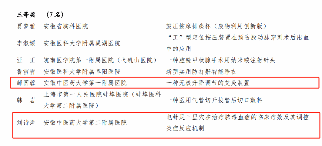 第一临床医学院内分泌科主管护师王珊珊参赛项目《改良夏慈消结散颈部中药外敷法》、第二临床医学院医务部主任、副主任医师吴杰参赛项目《通焦利眠贴配合揿针治疗肝火扰心型失眠的临床规律研究》分获中医组一等奖、三等奖;第一临床医学院治未病中心主治医师邹国蓉参赛项目《一种无极升降调节的艾灸装置》、第二临床医学院脑病七科主治医师刘诗洋参赛项目《电针足三里穴在治疗脓毒血症的临床疗效及其调控炎症反应机制》荣获临床组三等奖;第一临床医学院治未病中心主治医师张媛媛参赛项目《智能多关节伸缩排烟系统》、曙光安徽医院消毒供应室护师刘芳参赛项目《一种改良折叠式手术器械清洗消毒固定装置》荣获医技组三等奖。