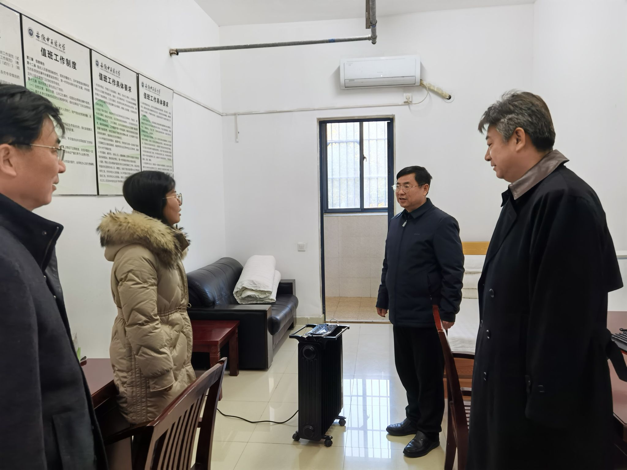 随后,谢瑞瑾一行前往少荃湖校区后走访了总值班室和门卫值班室,详细了解节日期间校园安全保障和值班安排情况,对值班人员为维护校园安全稳定所做的努力表示肯定与感谢。
