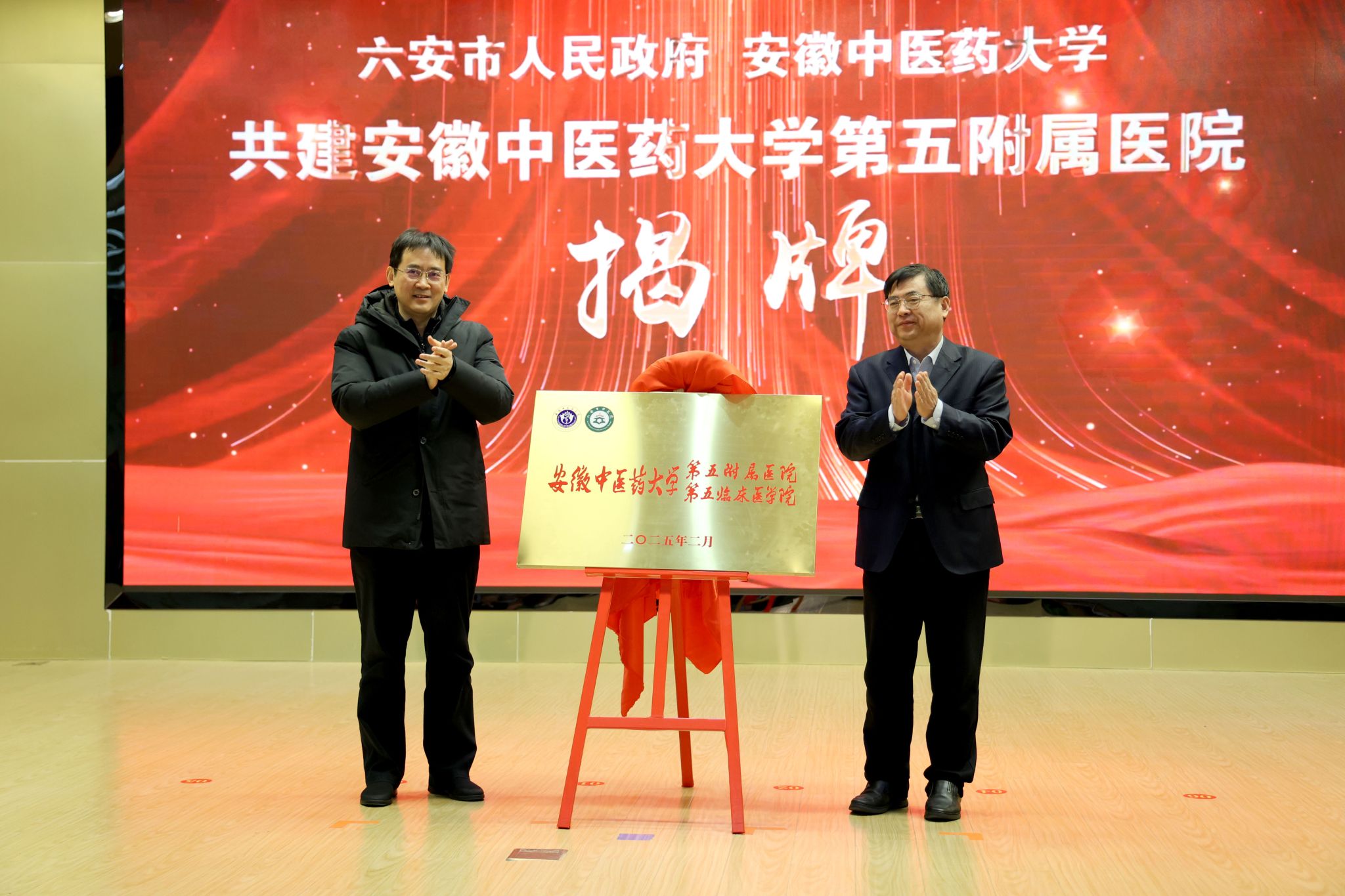 六安市委副书记、市长潘东旭与安徽中医药大学党委书记谢瑞瑾共同为“安徽中医药大学第五附属医院”揭牌