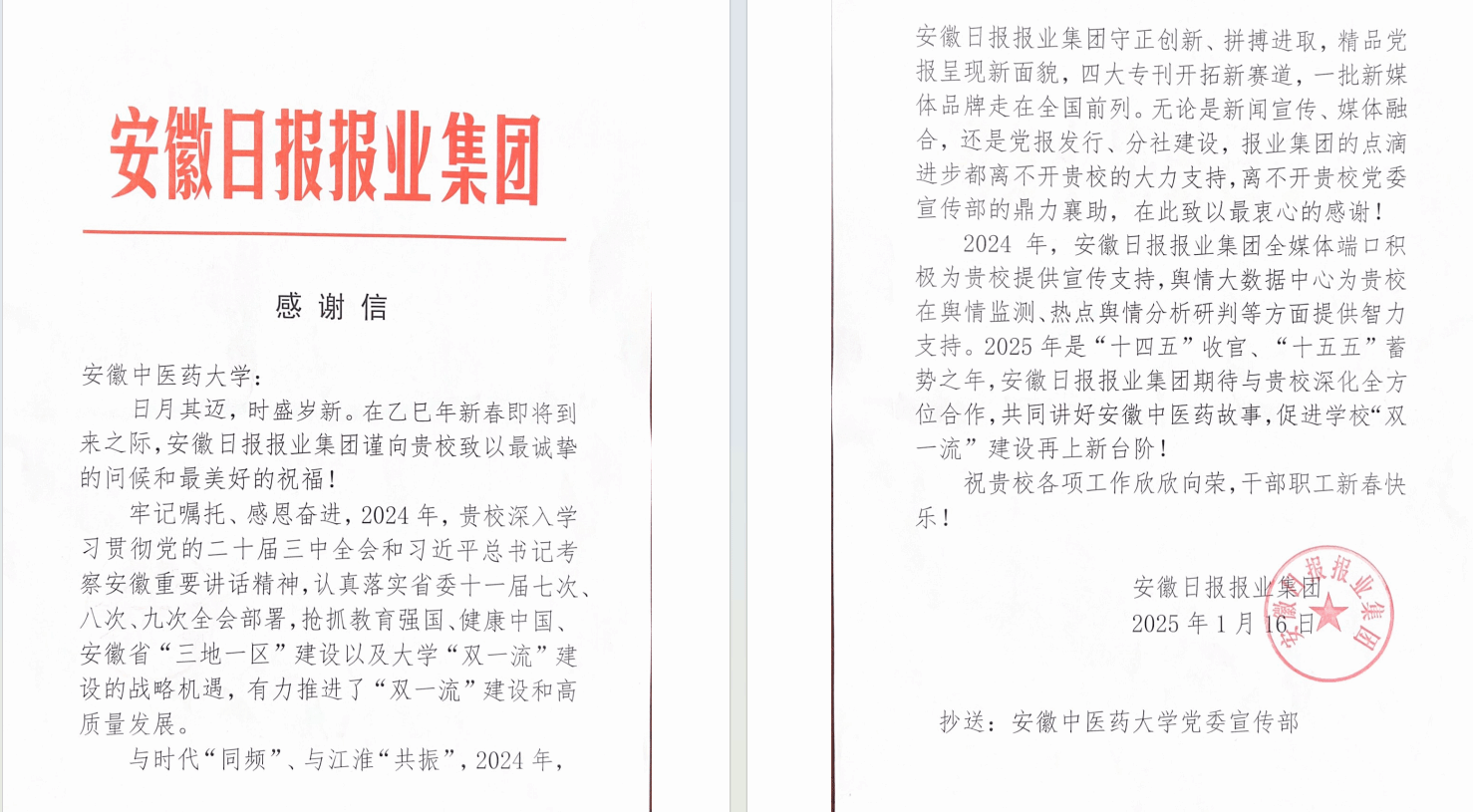 信中表示,2024年,安徽日报报业集团守正创新、拼搏进取,精品党报呈现新面貌,四大专刊开拓新赛道,一批新媒体品牌走在全国前列。无论是新闻宣传、媒体融合,还是党报发行、分社建设,报业集团的点滴进步都离不开安徽中医药大学的大力支持,离不开学校党委宣传部的鼎力襄助,在此致以最衷心的感谢。