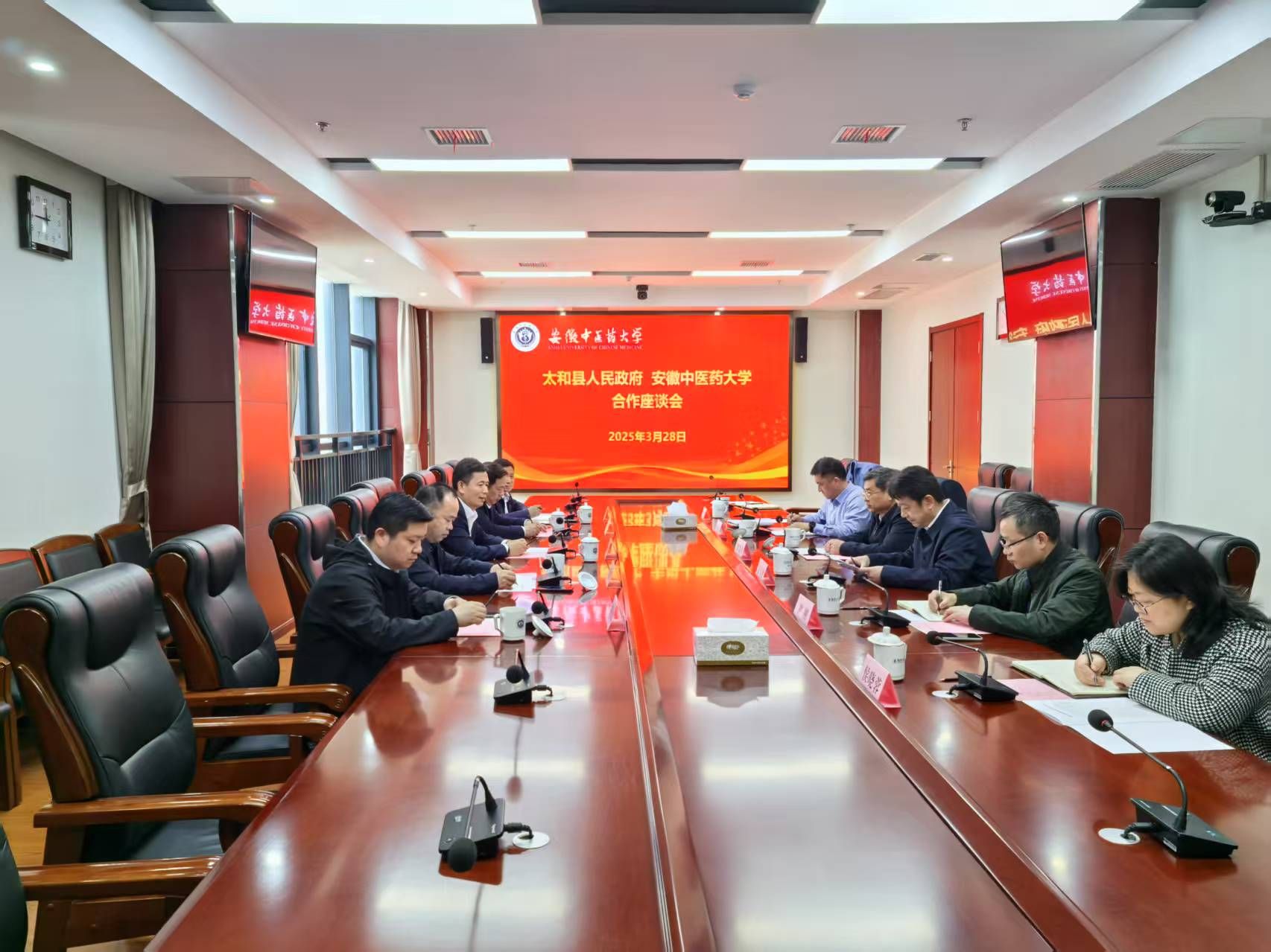 3月28日,太和县委副书记、县长陈建华一行来访我校,校党委书记谢瑞瑾,校党委常委、副校长、第一附属医院党委书记、曙光安徽医院党委书记聂久胜出席座谈会。