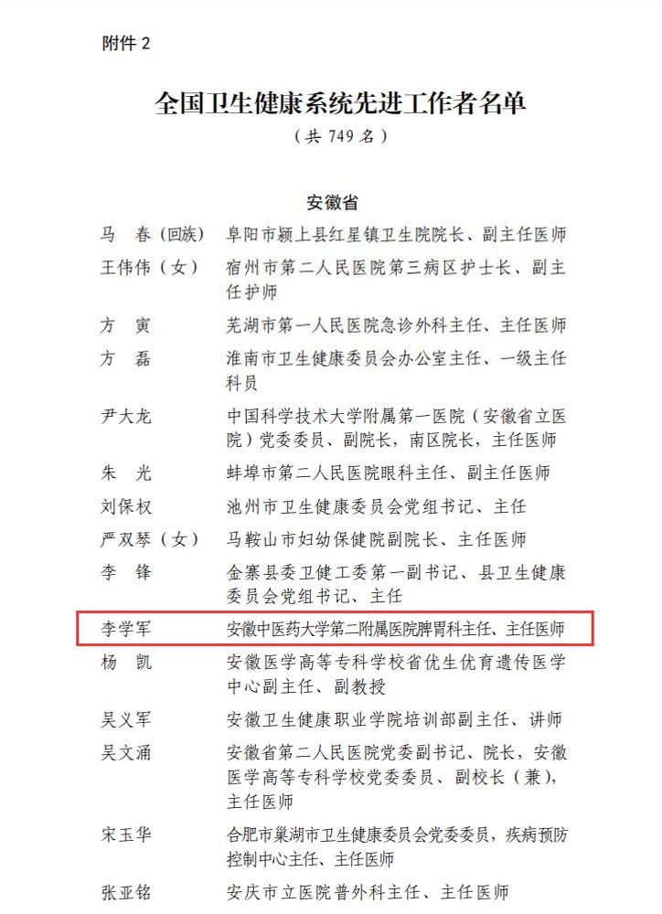 近日,人力资源社会保障部、国家卫生健康委、国家中医药局、国家疾控局决定,授予北京大学第三医院等326个单位“全国卫生健康系统先进集体”称号,授予马迎民等749名同志“全国卫生健康系统先进工作者”称号,授予于波等30名同志“‘白求恩奖章’获得者”称号,其中,我校第一临床医学院重症医学科-内科 ICU获“全国卫生健康系统先进集体”称号,第二临床医学院脾胃病科主任李学军荣获“全国卫生健康系统先进工作者”称号。