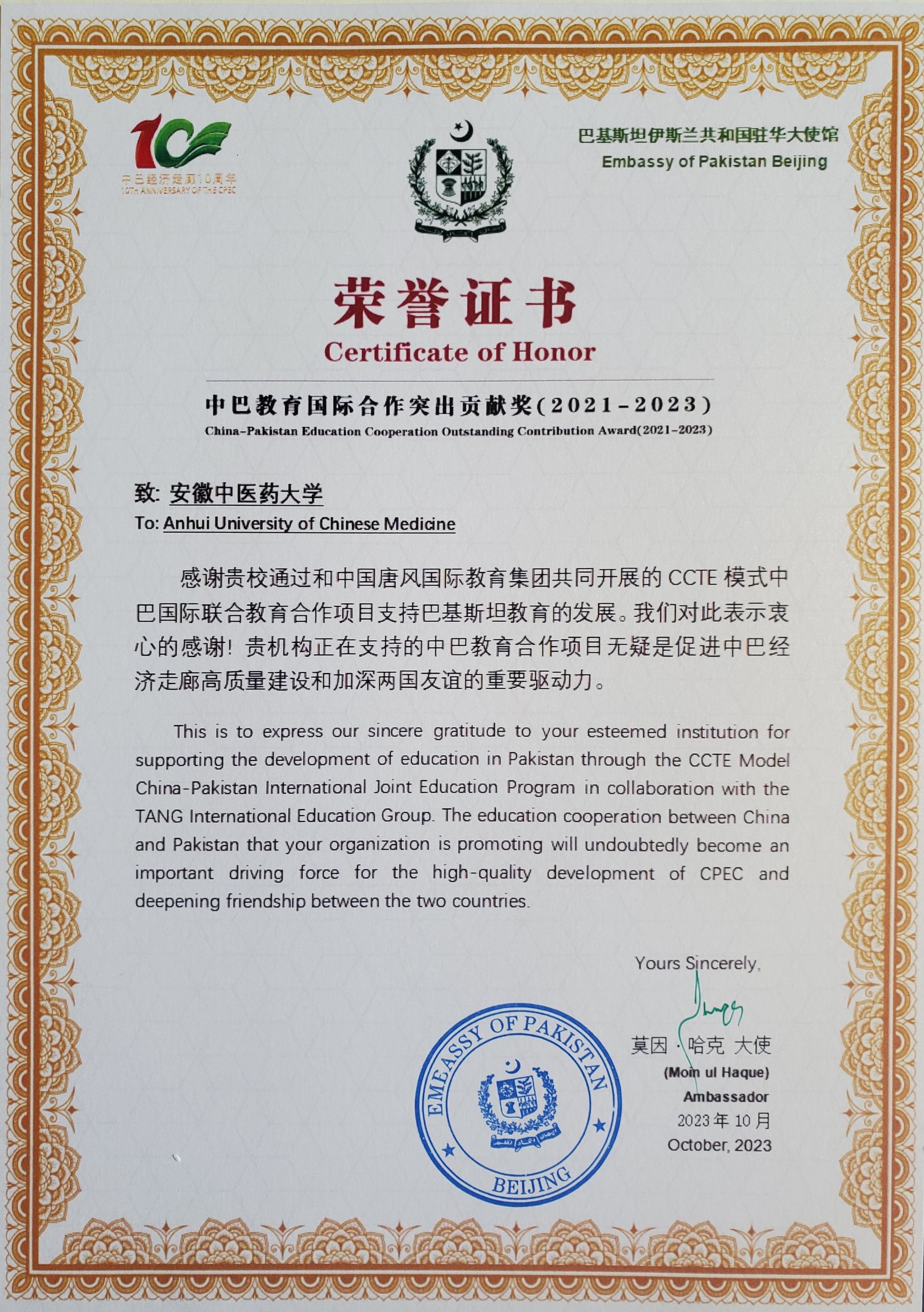 我校获授“中巴教育国际合作突出贡献奖”