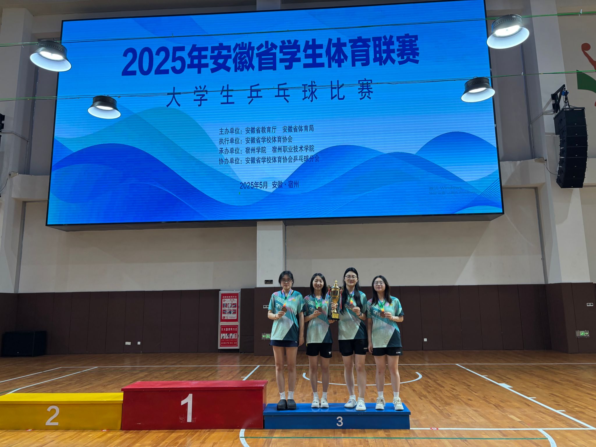 5月24-29日,2025年安徽省学生体育联赛大学生乒乓球比赛在宿州职业技术学院举行。我校选手凭借精湛的球技和默契的配合,最终取得女子团体季军、男女混双亚军和女子单打第八名的好成绩。