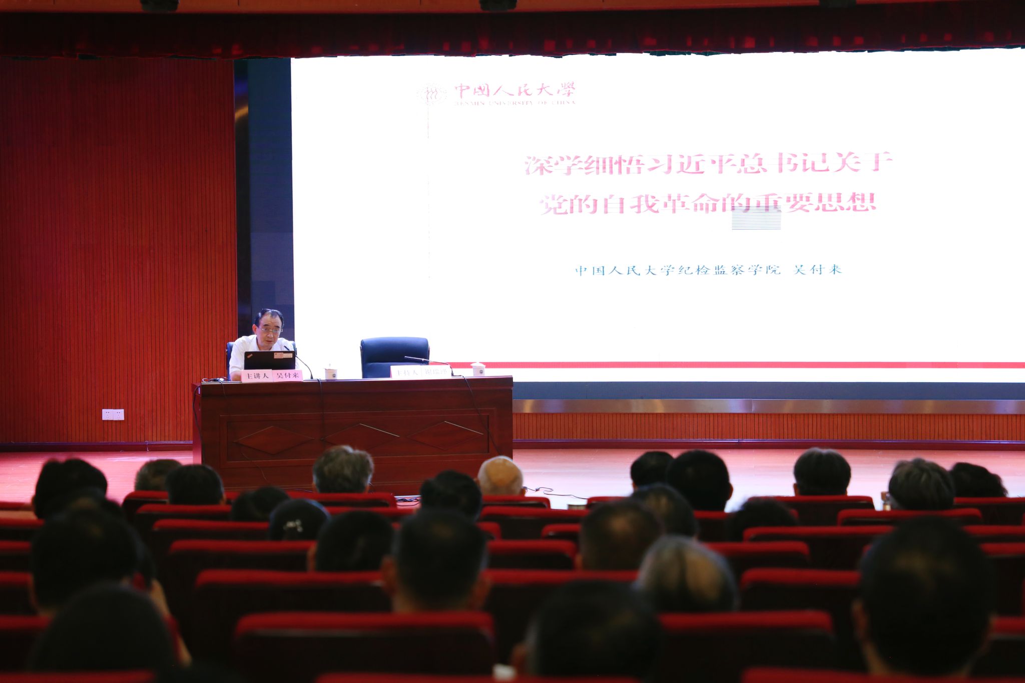 会议邀请中国人民大学学术委员会委员、纪检监察学院学术委员会主任、博士生导师吴付来教授作题为《深学细悟习近平总书记关于党的自我革命的重要思想》的辅导报告。吴付来教授从“党的十八大以来,在推进全面从严治党伟大实践中,我们党给出了跳出历史周期率的第二个答案”“不断深化对党的自我革命的规律性认识”“纵深推进全面从严治党、党的自我革命,为强国建设、民族复兴伟业提供坚强保障”等三个方面进行深入浅出的讲解。他指出,要坚持和加强党中央集中统一领导,坚定党员干部理想信念,不断完善制度规范体系,深刻理解新时代党的自我革命的践行要求,在新时代新征程上将党的自我革命不断推向深入。讲座现场座无虚席、气氛热烈,360余名听众认真听讲、专心记录。