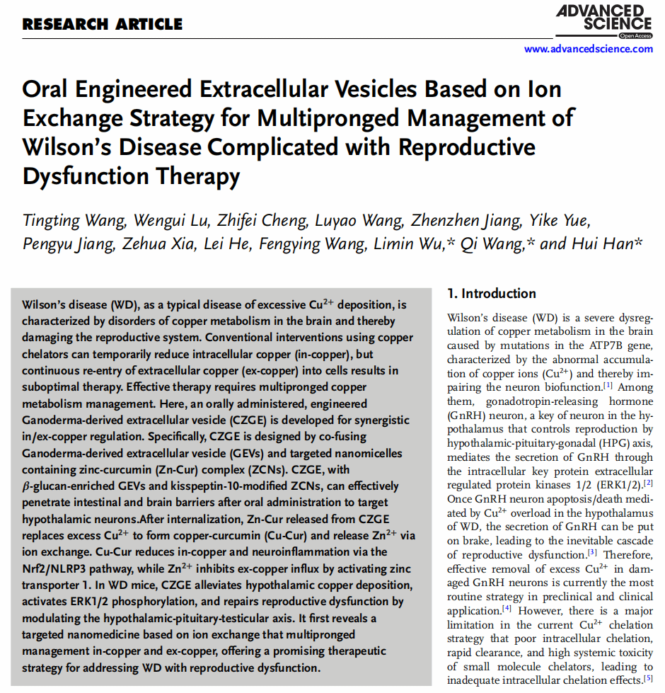 近日,我校第一临床医学院神经内科韩辉主任医师团队联合药学院王琪副研究员团队等在国际知名期刊《Advanced Science》(中科院1区TOP,IF=14.3)发表题为“Oral engineered extracellular vesicles based on ion exchange strategy for multipronged management of Wilson's disease complicated with reproductive dysfunction therapy”的研究性论文。2023级博士研究生王婷婷与2022级硕士研究生卢文贵为论文的共同第一作者,韩辉、王琪等为文章的共同通讯作者,学校为第一作者和通讯作者单位。