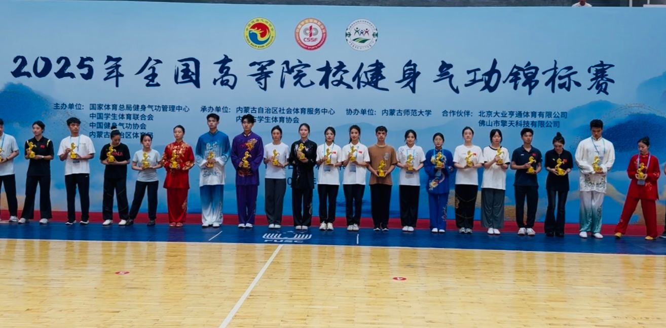 7月26日至31日,2025年全国高等院校健身气功锦标赛在内蒙古呼和浩特市隆重举行。本次赛事由国家体育总局健身气功管理中心、中国学生体育联合会、中国健身气功协会及内蒙古自治区体育局联合主办,汇聚了来自全国29个省市自治区的300余支高校代表队、1300余名运动员同台竞技。我校代表队沉着应战,发挥出色,最终斩获团体赛一等奖1项、二等奖2项,个人赛一等奖1项、二等奖3项,并摘得1枚银牌。