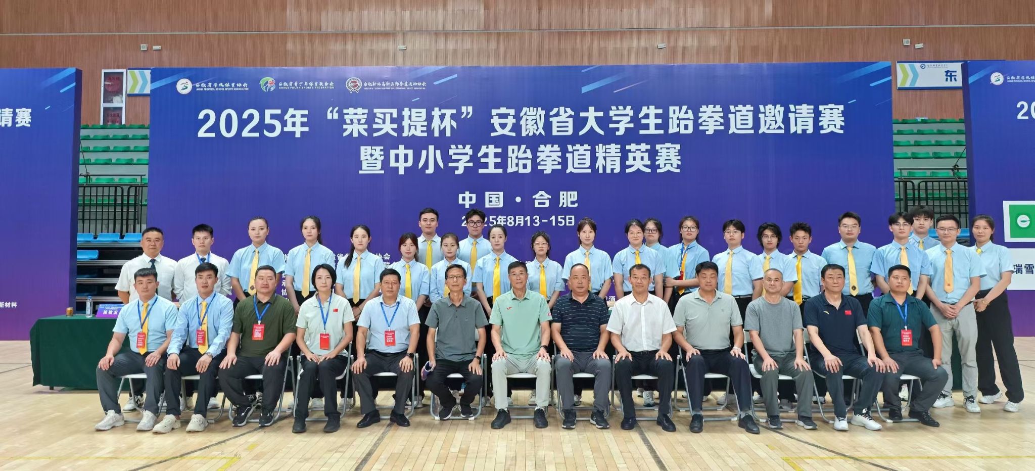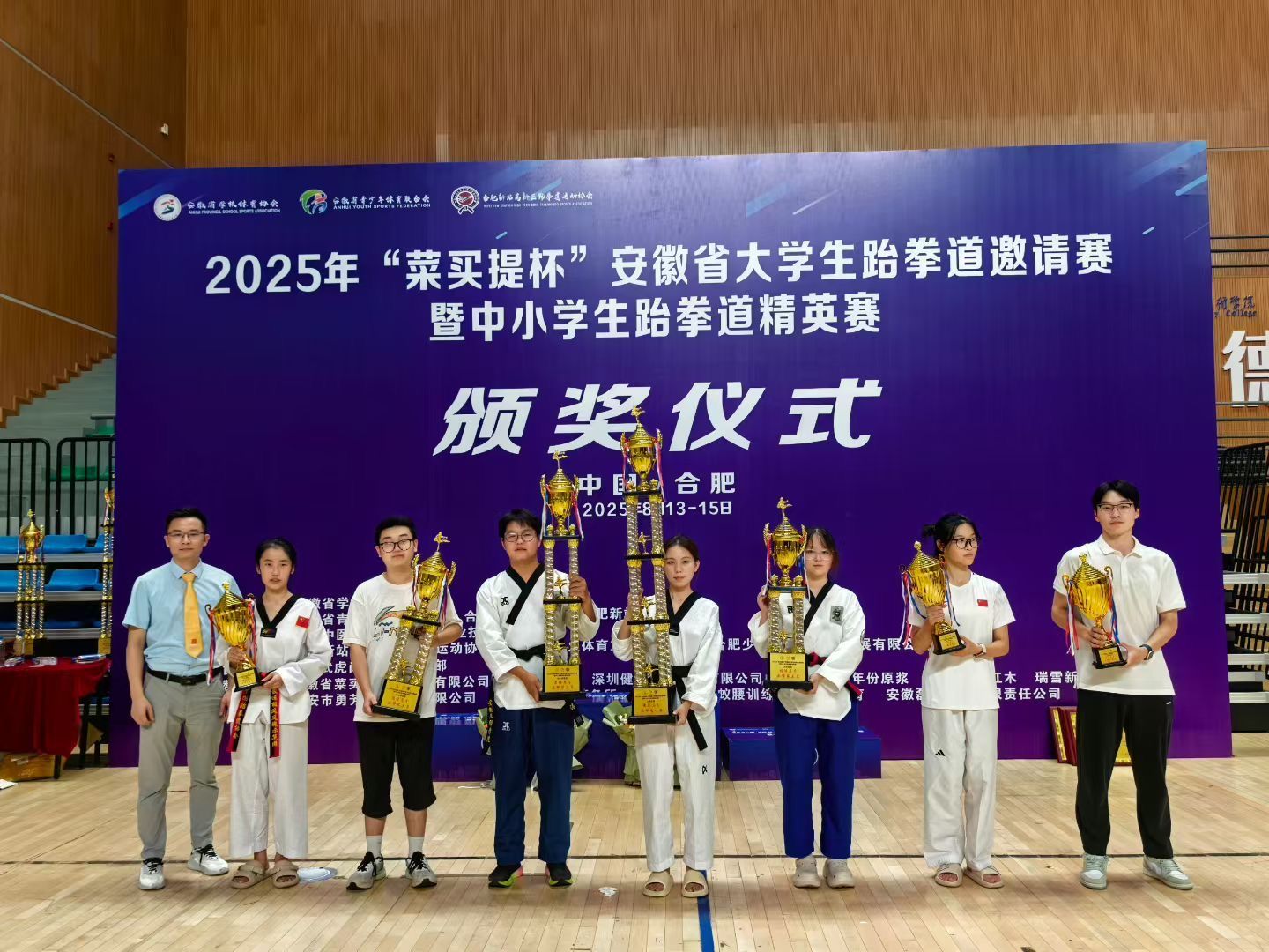 8月13日至15日,由安徽省青少年体育联合会、安徽省学校体育协会联合主办的2025年安徽省大学生跆拳道邀请赛暨中小学生跆拳道精英赛在合肥职业技术学院举行。我校代表队共取得12金9银5铜及多项第五的好成绩,最终以品势团体154.5分,竞技团体31分的优异成绩获得团体总分第一名、竞技团体总分第三名。