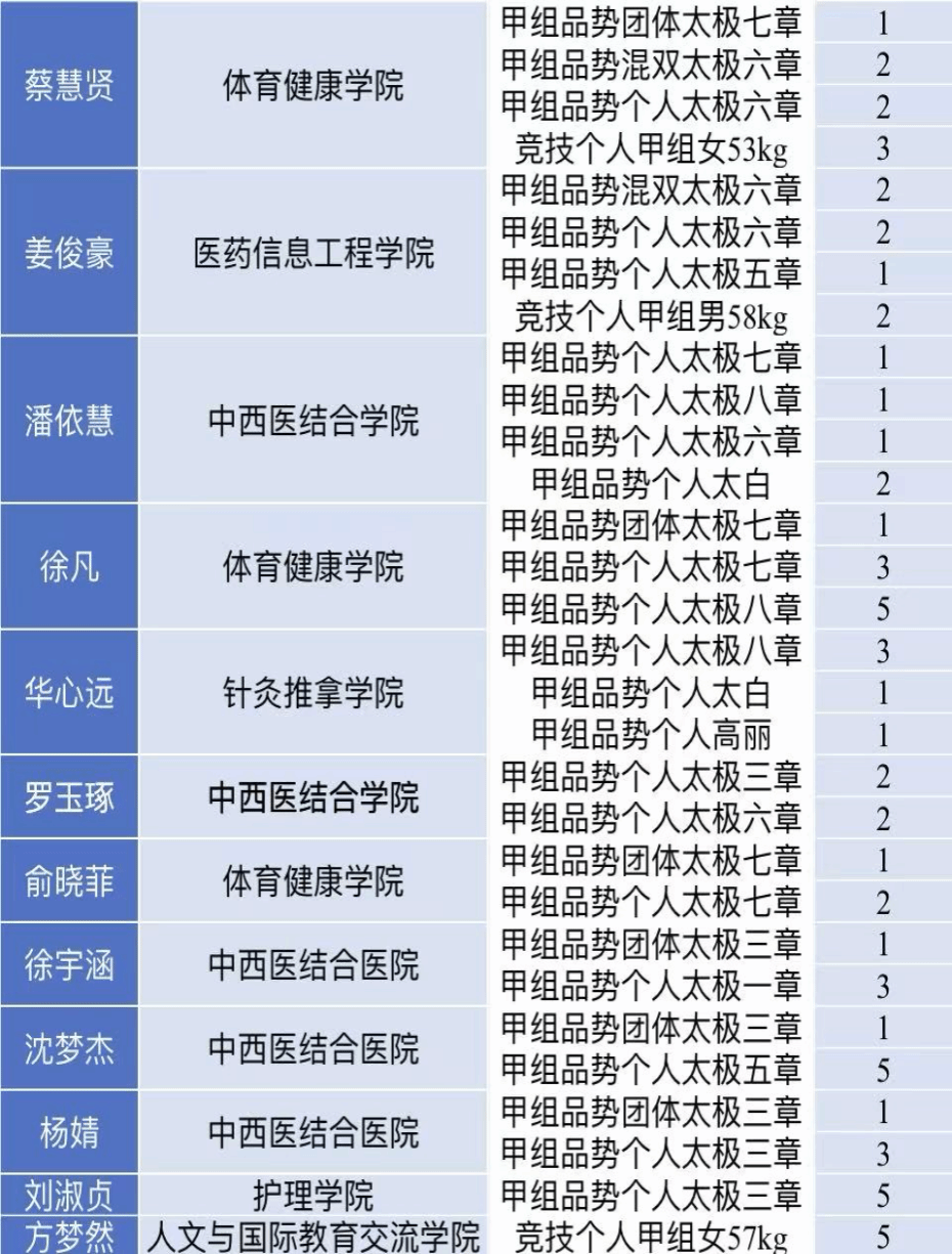 女子品势项目中,蔡慧贤、徐凡、俞晓菲组成的女子三人团体,以动作整齐度、韵味诠释力,展现跆拳道项目独特魅力,斩获女子三人团体品势金牌。男子竞技甲组58kg的赛场,来自医药信息工程学院的姜俊豪,面对强劲对手,凭借精准战术布局与稳定技术输出,冷静应对攻防转换,最终摘得该级别银牌。华心远、潘依慧、蔡慧贤获评“优秀运动员”称号,董纪鹏老师获评“优秀教练员”称号。