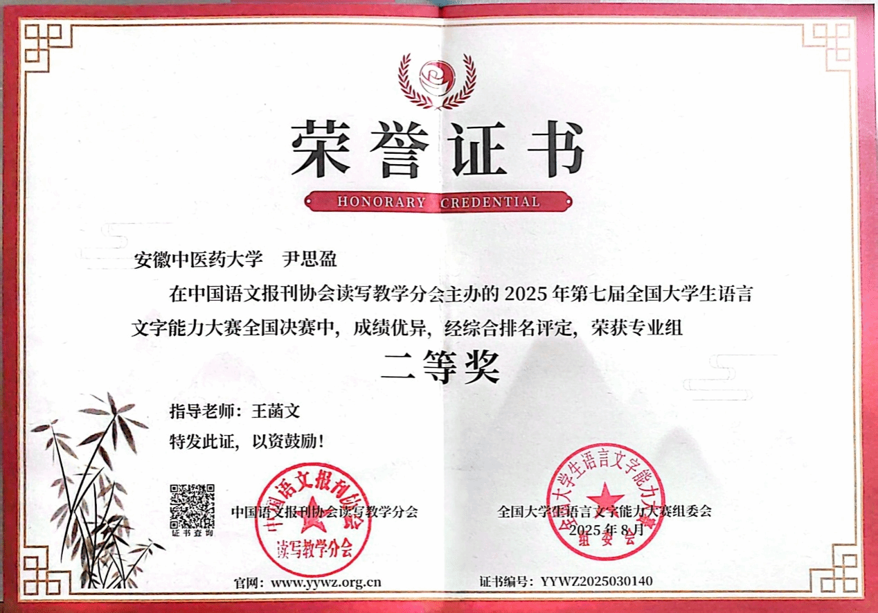 近年来,学校语委办积极组织并指导学生参与各类高水平学科竞赛,学生荣获全国首届及第二届国际中文教育教学技能大赛三等奖;在安徽省首届国际中文教学微课大赛中,勇夺一等奖1项、二等奖1项、三等奖3项,充分展现了我校在国际中文教育领域的教学实力与人才培养成效。(校语委办/供稿 叶兰兰/审核)