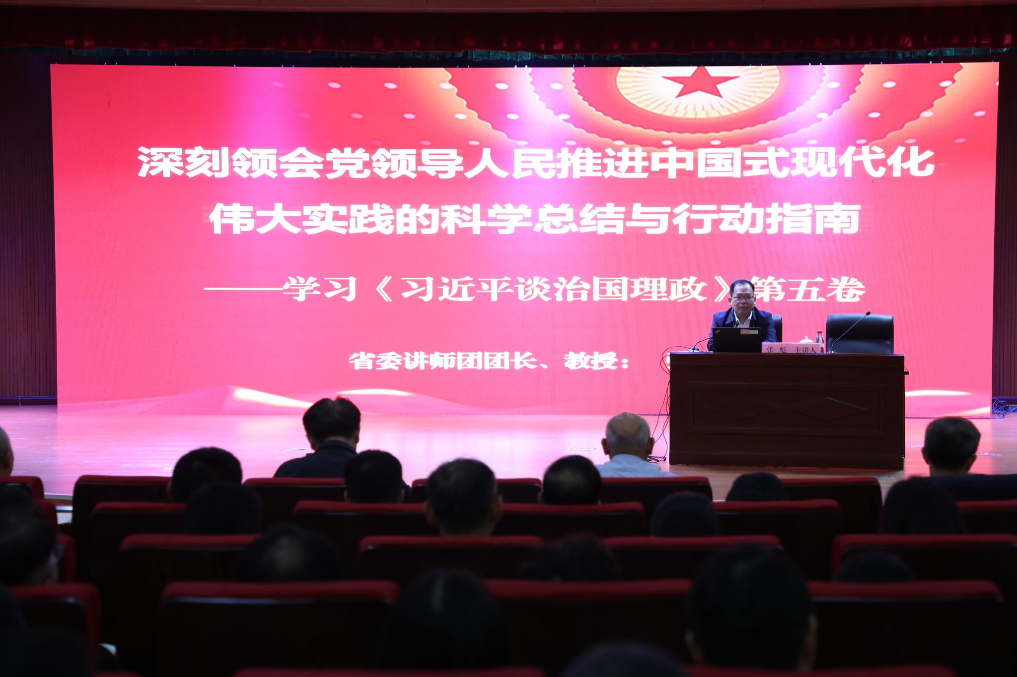 第一阶段,会议邀请安徽省委讲师团团长张彪教授作《深刻领会党领导人民推进中国式现代化伟大实践的科学总结与行动指南——学习<习近平谈治国理政>第五卷》专题辅导报告。他从深刻领会《习近平谈治国理政》第五卷的重大意义、准确把握《习近平谈治国理政》第五卷的丰富内涵、深刻把握“两个结合”是取得成功的最大法宝、精心组织学好用好《习近平谈治国理政》第五卷等方面,系统梳理了第五卷的框架结构和逻辑脉络,深刻阐释了其中蕴含的新理念新思想新战略,并结合我校建设改革发展实际对如何学好用好这部重要著作提出了指导性意见。