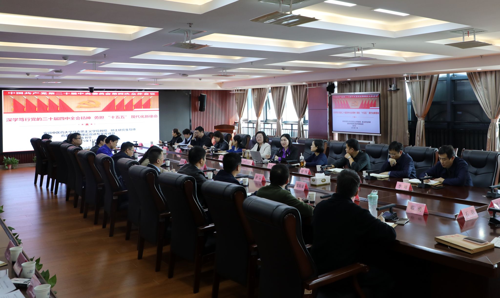 会议邀请马克思主义学院陈书华教授作专题辅导报告。陈书华从党的二十届四中全会重大意义、“十四五”重大成就、“十五五”面临发展环境与行动纲领以及如何贯彻落实全会精神等方面进行深入解读。