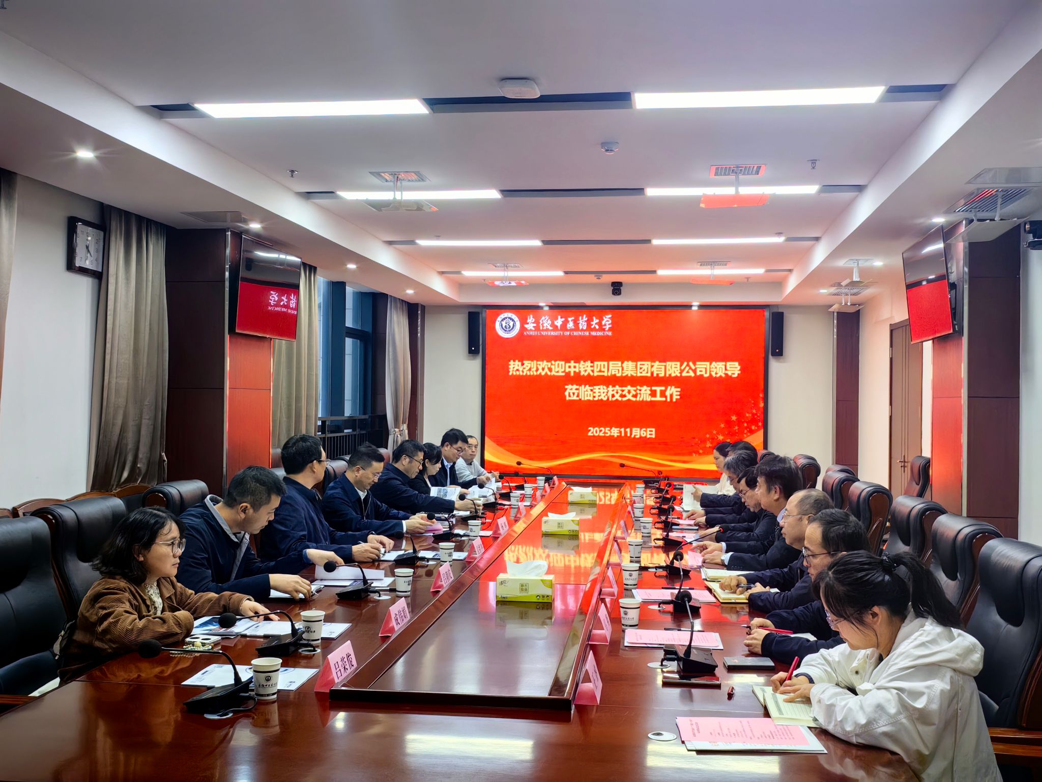11月6日下午,中铁四局集团有限公司总经理杨辉率队到访我校,就梅山路校区学生宿舍建设项目进行洽谈交流。校党委书记谢瑞瑾热情接待杨辉一行,校党委常委、副校长魏骅、聂久胜及发展改革处、国有资产管理处、总务处等部门同志参加洽谈。会议由聂久胜主持。