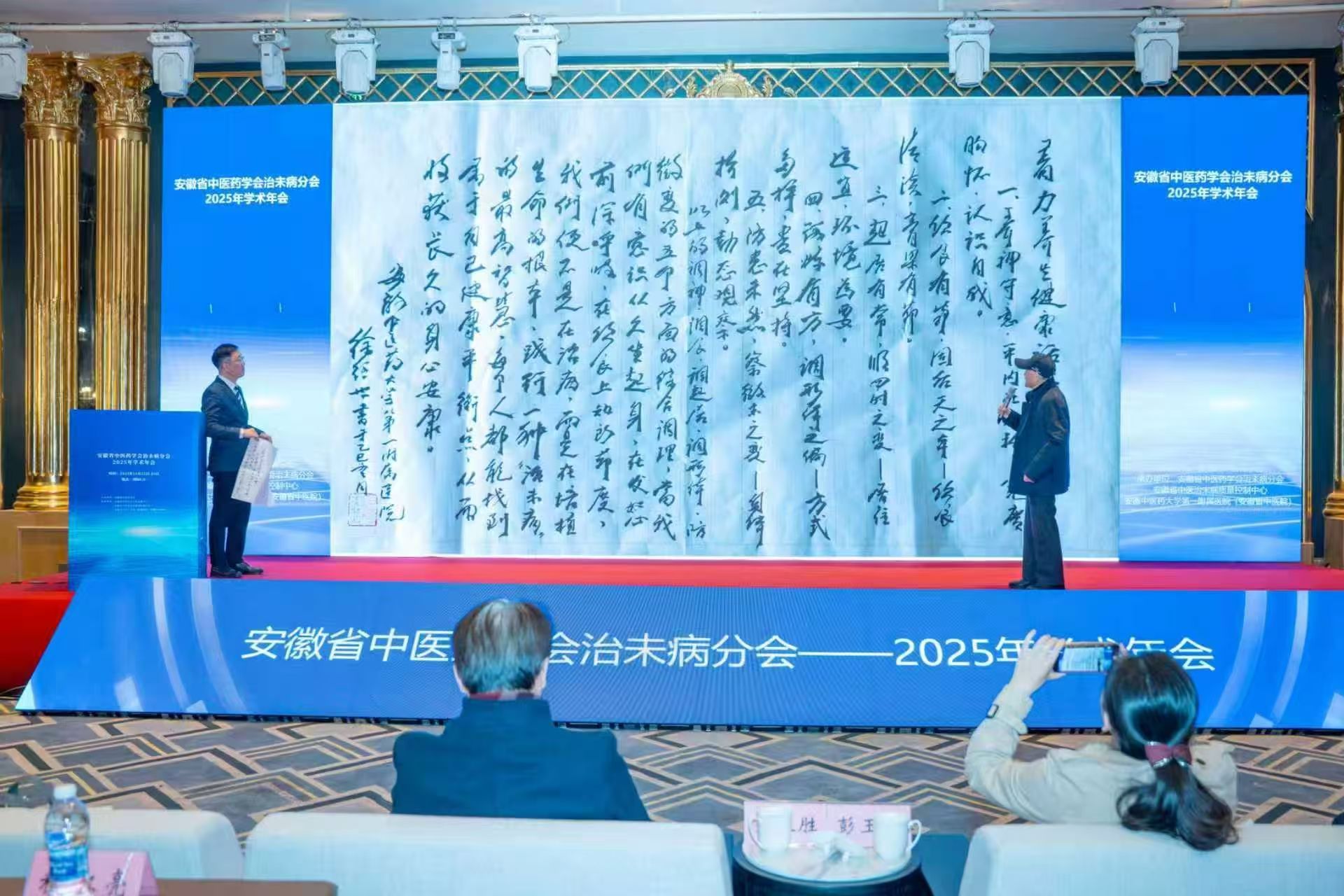 会上,徐经世先生将亲笔题写墨宝赠与安徽省中医药学会治未病专业委员会。此举不仅是对专业委员会工作的极大肯定,更是对“治未病”中医核心理念的传承与弘扬,为中医药事业的发展注入了深厚的文化力量。徐老精准凝练概括了中医“治未病”养生健康五条:“养神守意,饮食有节,起居有常,锻炼有方,防患未然”。希望专业委员会的同仁们能时刻铭记中医的立身之本,将“预防为主”的战略思想深植于心、践之于行,在健康维护和疾病防控中更好地发挥中医药的独特优势。(舒云峰/文图 聂久胜/审核)
