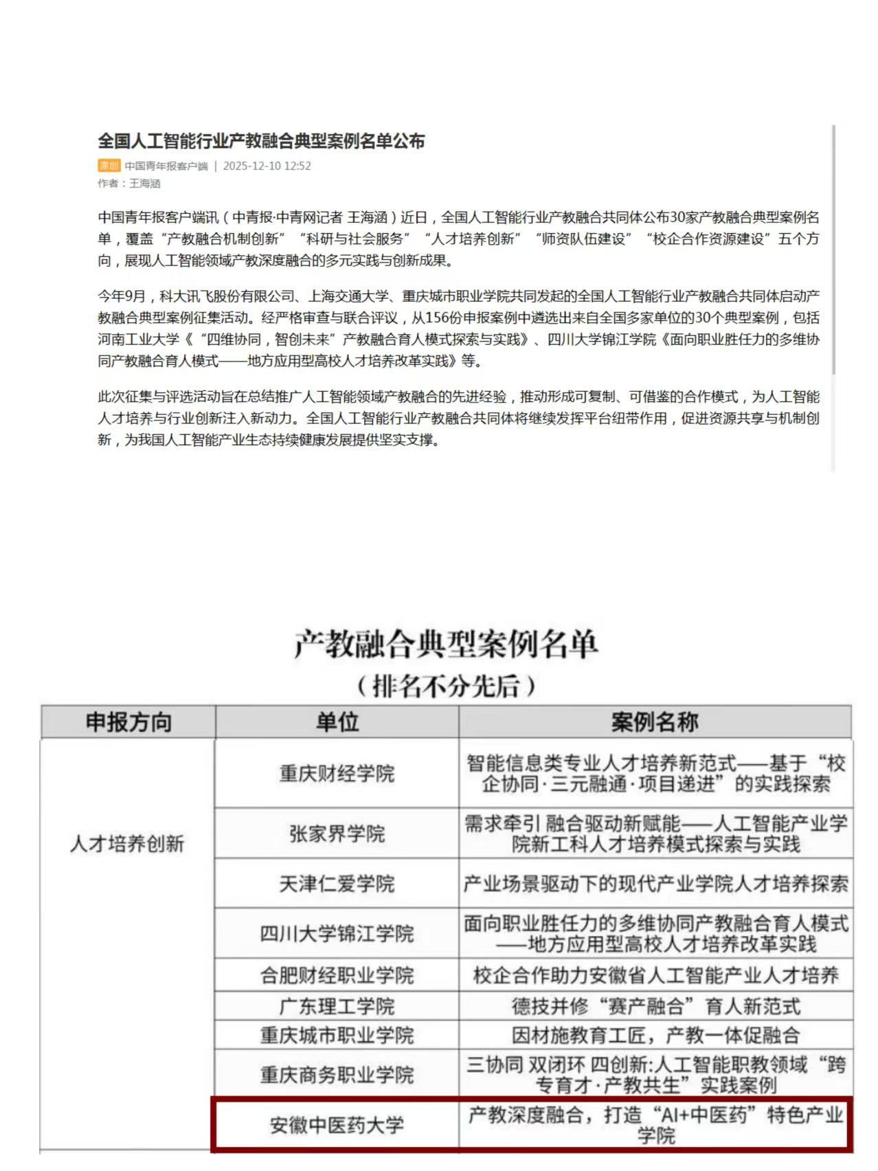近日,全国人工智能行业产教融合共同体正式公布产教融合典型案例名单,我校报送的《产教深度融合,打造“AI + 中医药”特色产业学院》案例凭借鲜明的跨界融合特色、扎实的实践成效与显著的行业示范价值,从156个申报案例中脱颖而出,成功入选 30 个产教融合典型案例,标志着学校在中医药与人工智能交叉领域的产教融合育人探索获得全国行业认可。