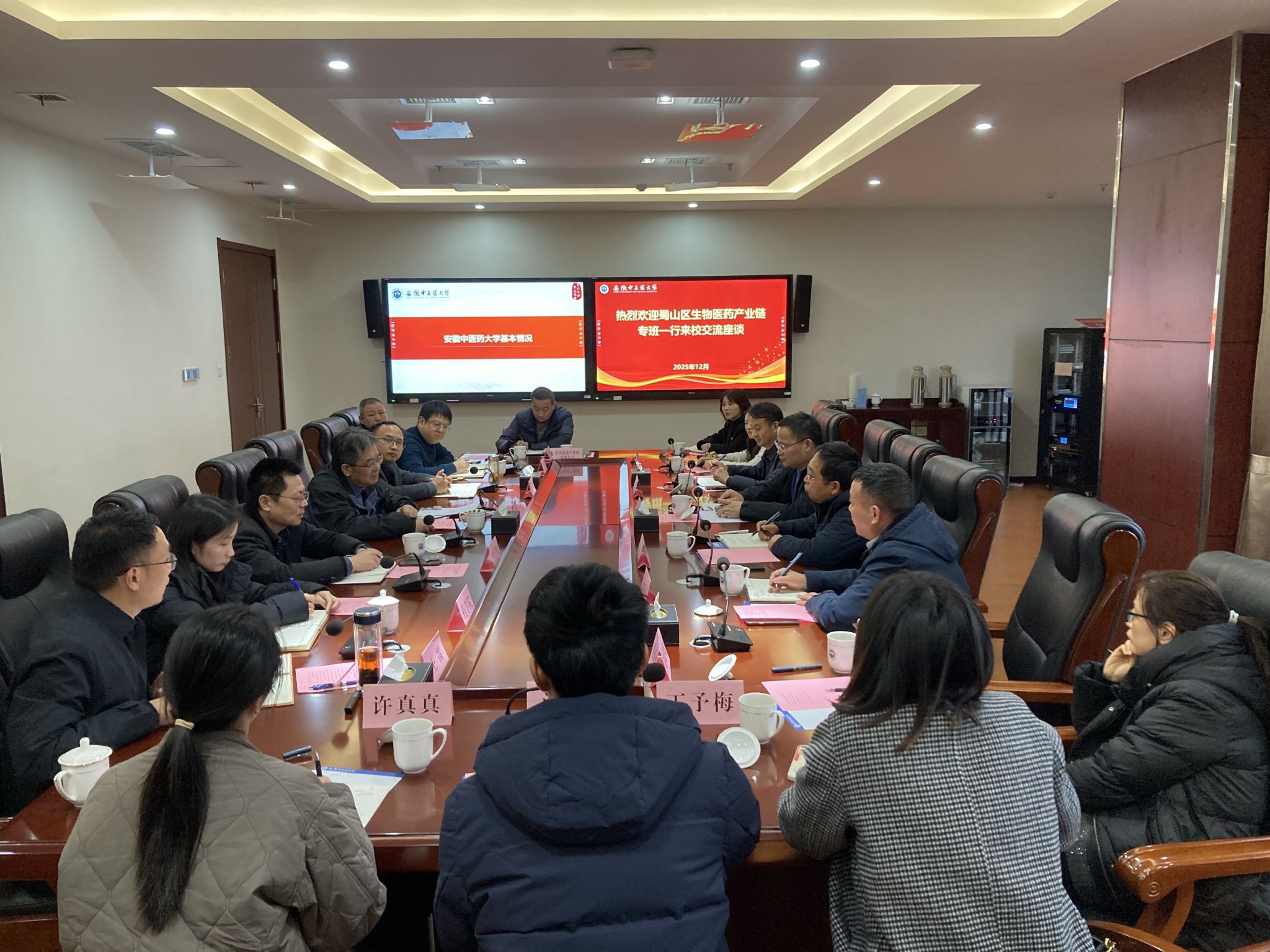 12月12日下午,蜀山区政府副区长王祖胜带领合肥市蜀山区生物医药产业链专班来校洽谈合作。党委常委、副校长魏骅,科技处、药学院、平台管理处、社会合作处、资产经营有限公司、大学科技园相关负责人参加座谈。