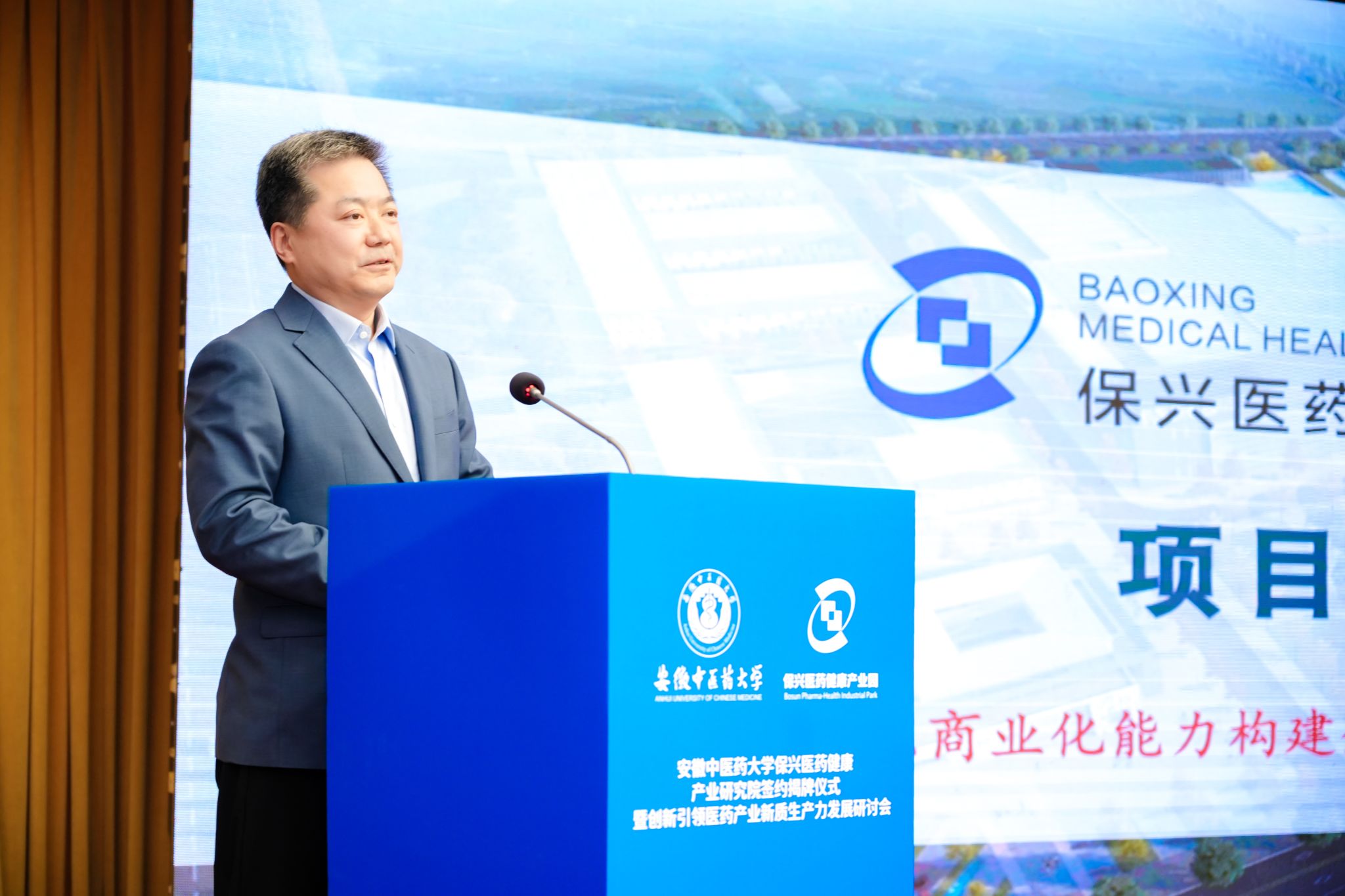 谢瑞瑾代表学校向与会嘉宾表示热烈欢迎和衷心感谢。他指出,此次合作是贯彻落实“促进中医药传承创新发展,推进中西医结合”重要部署的切实行动,也是回应省委“创新之问”、培育医药新质生产力的重要担当。安徽中医药大学正奋力推进“一流中医药大学”建设,持续深化校地合作,依托国家转化医学科学中心(上海)合肥分中心等高能级平台,已在中医药研发与转化方面取得系列关键突破。这次与保兴产业园共建研究院,旨在打造集“医药产业发展研究高地、高端智库与产教融合平台”于一体的创新载体,将为“健康中国”和谱写中国式现代化安徽篇章贡献更大力量。