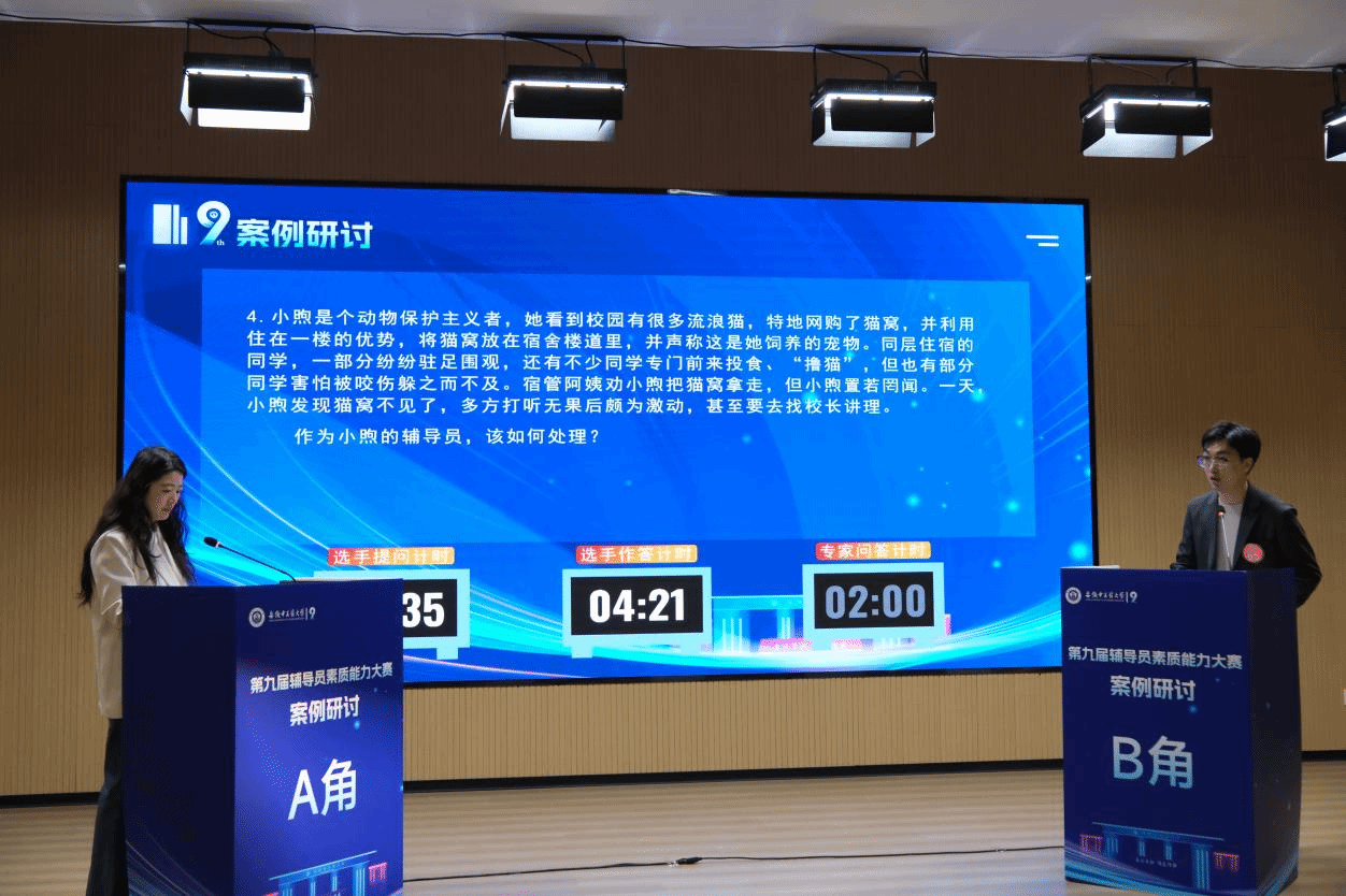 本次大赛分初赛、决赛两个阶段,初赛为基础知识测试及班情熟知考核,全体一线专职辅导员参加;决赛设置案例研讨、谈心谈话两个环节,案例研讨环节中,选手以“你问我答”形式进行思维碰撞与对策分析;谈心谈话环节模拟真实工作场景,重点考察辅导员对学生特点、成长成才规律的把握,以及教育引导、解决困惑和实际问题的综合能力。