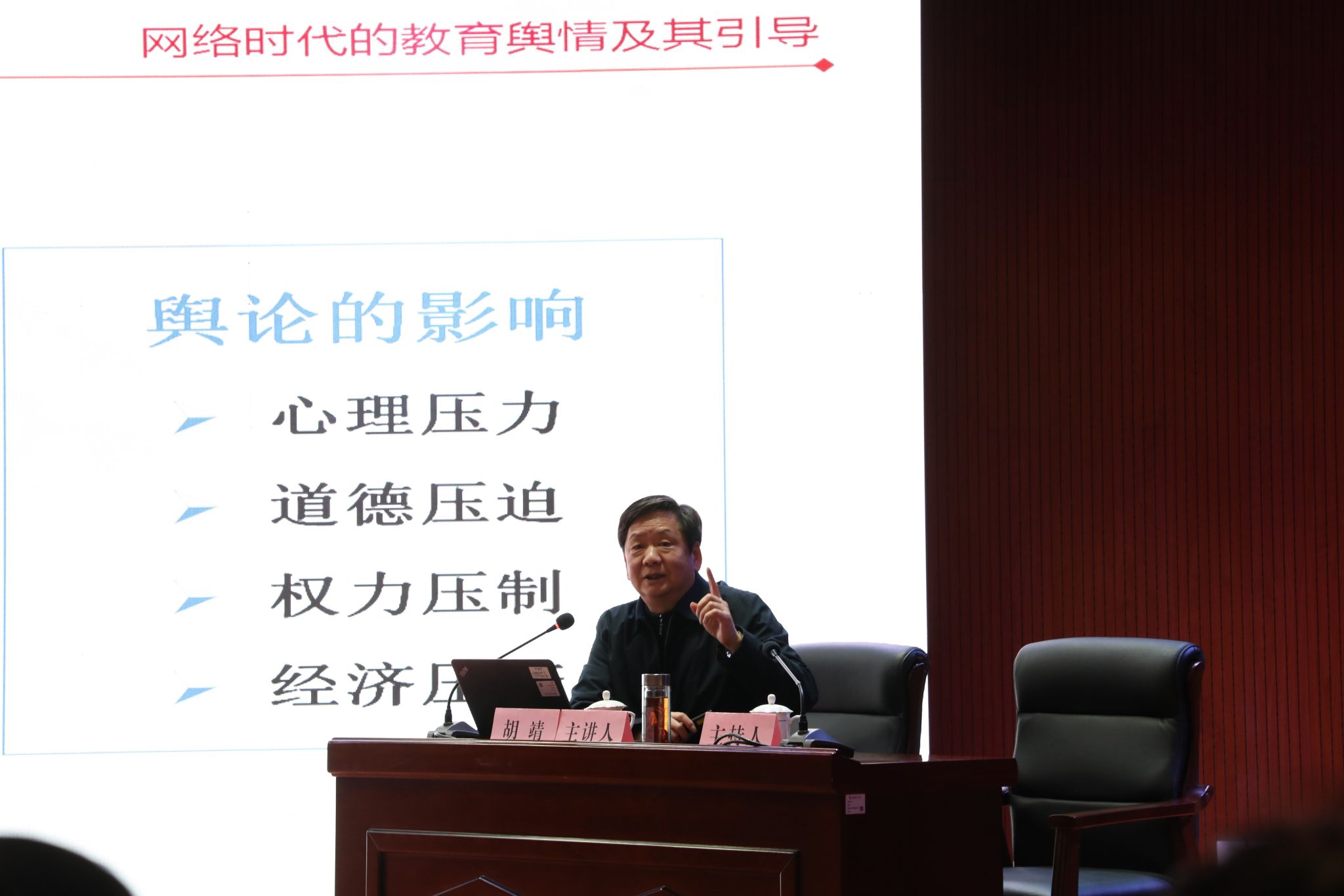 会议特邀安徽省社会科学院党组成员、副院长胡靖作《网络时代的教育舆情及其引导》报告。胡靖教授从“舆论与舆情,网络舆情特点与处置,网络教育舆情与舆论引导”等三方面作深入解析。报告内容丰富、案例翔实,逻辑清晰、针对性强,对做好新时代、新征程下网络思想政治工作和舆情应对工作具有很强的指导意义。