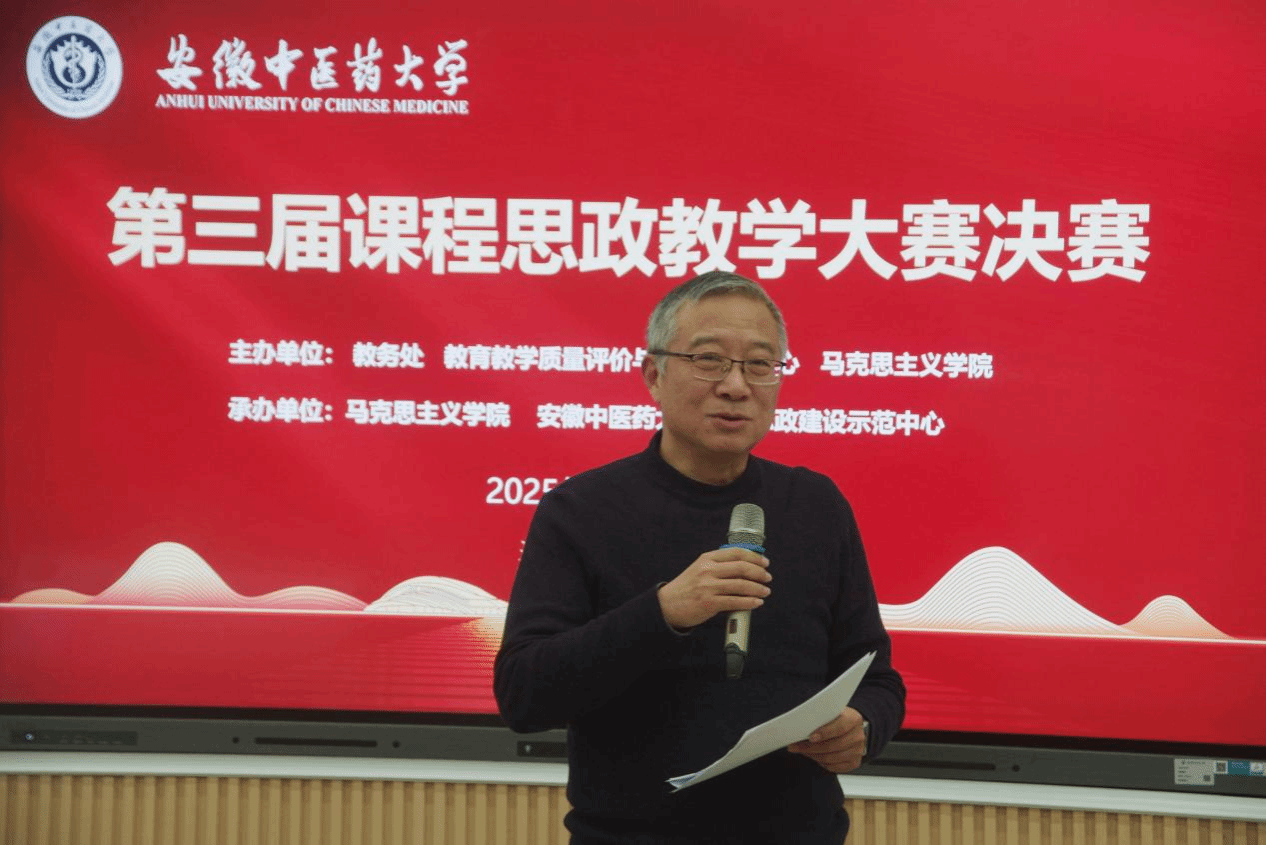 桂双英在致辞中强调,立德树人成效是检验学校一切工作的根本标准,全面推进课程思政建设是落实立德树人根本任务的战略举措。桂双英指出,学校课程思政建设必须牢牢把握教师队伍“主力军”、课程建设“主战场”,系统构建协同育人格局。近年来,学校依托课程思政建设示范中心,建立了“红色杏林”大思政课专题网站,出版了《安徽中医药大学课程思政教学案例选编》,引导专业课教师充分挖掘专业课程蕴含的思政元素,让思政教育如春风化雨般融入课堂教学,浸润学生心灵。桂双英指出,本次课程思政教学大赛既是我校课程思政建设成果的一次集中展示,也是老师们教学水平与育人能力的一场同台竞技。希望各位参赛教师赛出水平、赛出风采,充分展现我校专业教师课程思政教育教学能力,为全校教师提供示范。