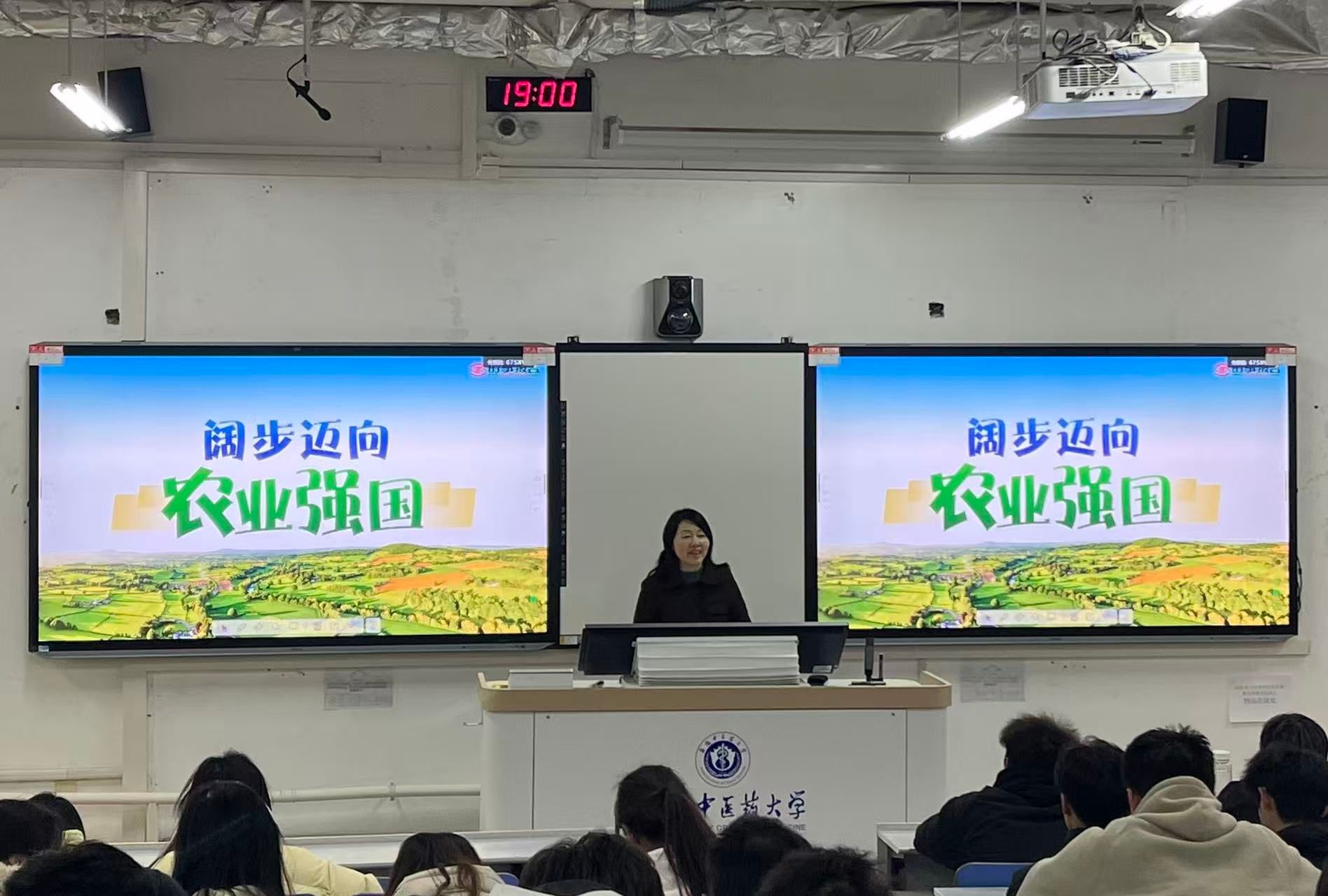 学校党委常委、副校长桂双英为药学院2025级中药学专业学生讲授《阔步迈向农业强国》专题。她结合国家农业发展与中医药事业振兴的重要部署,围绕“我们为何要加快建设农业强国、我们要建设什么样的农业强国、我们要怎样加快建设农业强国”三个层面展开,着重阐释农业强国建设与中药材种植、道地药材培育、中医药产业发展的深度关联,详实梳理了农业基础对中医药原料供应、产业升级的支撑作用。桂双英勉励同学们要立足专业所长,将农业发展规律与中药资源开发利用相结合,为农业强国建设和中医药事业振兴双向赋能。
