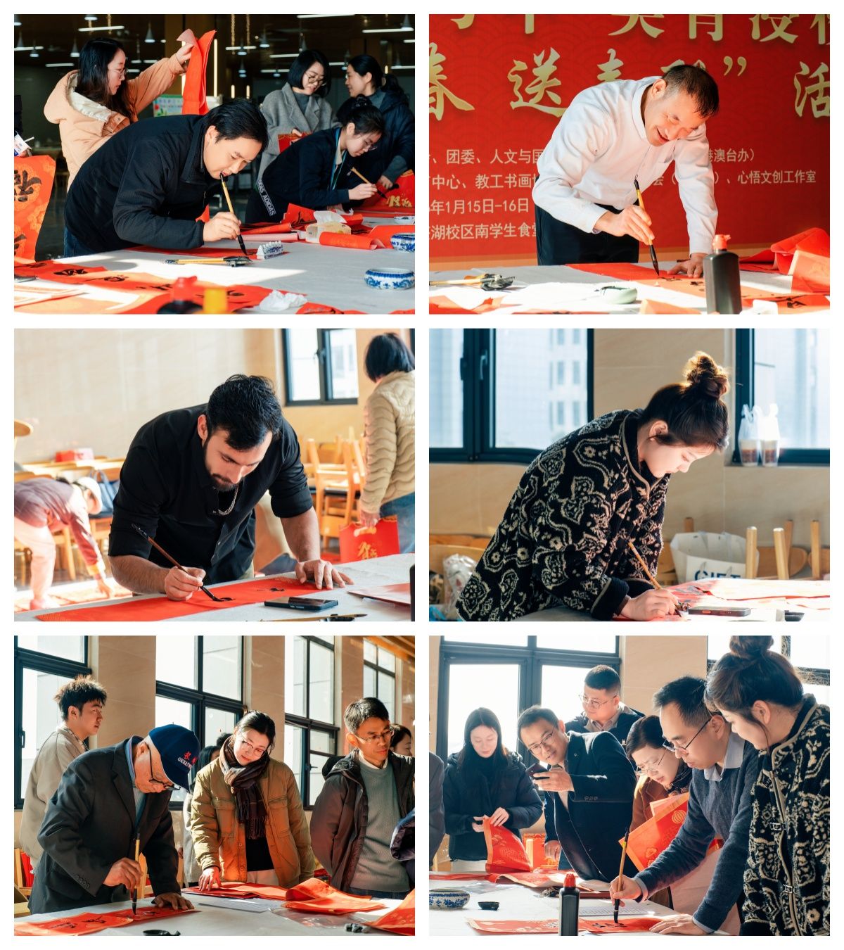 为弘扬中华优秀传统文化,深入实施学校美育浸润行动,营造喜庆祥和、积极向上的新春校园文化氛围。1月15—16日中午,由校工会、团委、人文与国际教育交流学院(外事办、港澳台办)联合主办,美育中心、教工书画协会、大学生书画协会(俱乐部)、心悟文创工作室共同承办的“书香沁马年 美育浸校园”第三届“迎新春 送春联”活动在少荃湖校区温情开展。