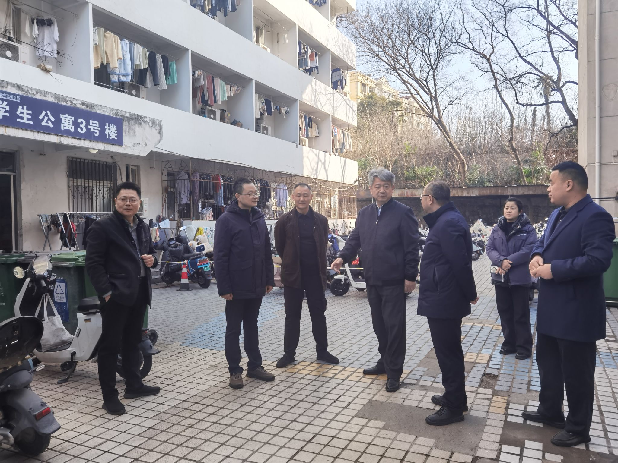 为确保春节期间校园安全稳定,消除各类安全隐患,近日,校党委常委、副校长聂久胜率领保卫处、总务处、办公室、教务处、学生处及平台管理处负责人,深入梅山路校区与少荃湖校区,对校园重点区域和关键环节开展安全大检查,并召开现场安全调度会。