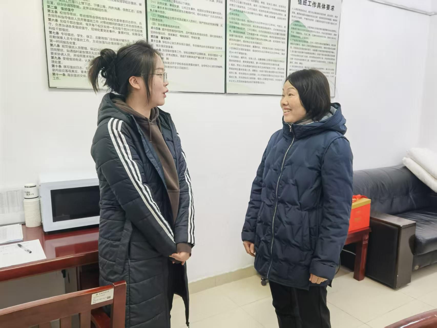桂双英在少荃湖校区走访慰问了总值班室和门卫值班室,认真查看校园安全监控和值班记录,详细了解节日期间校园运行保障和应急值守情况,并亲切慰问了在校留学生,询问他们的假期学习生活情况,送上新春祝福。