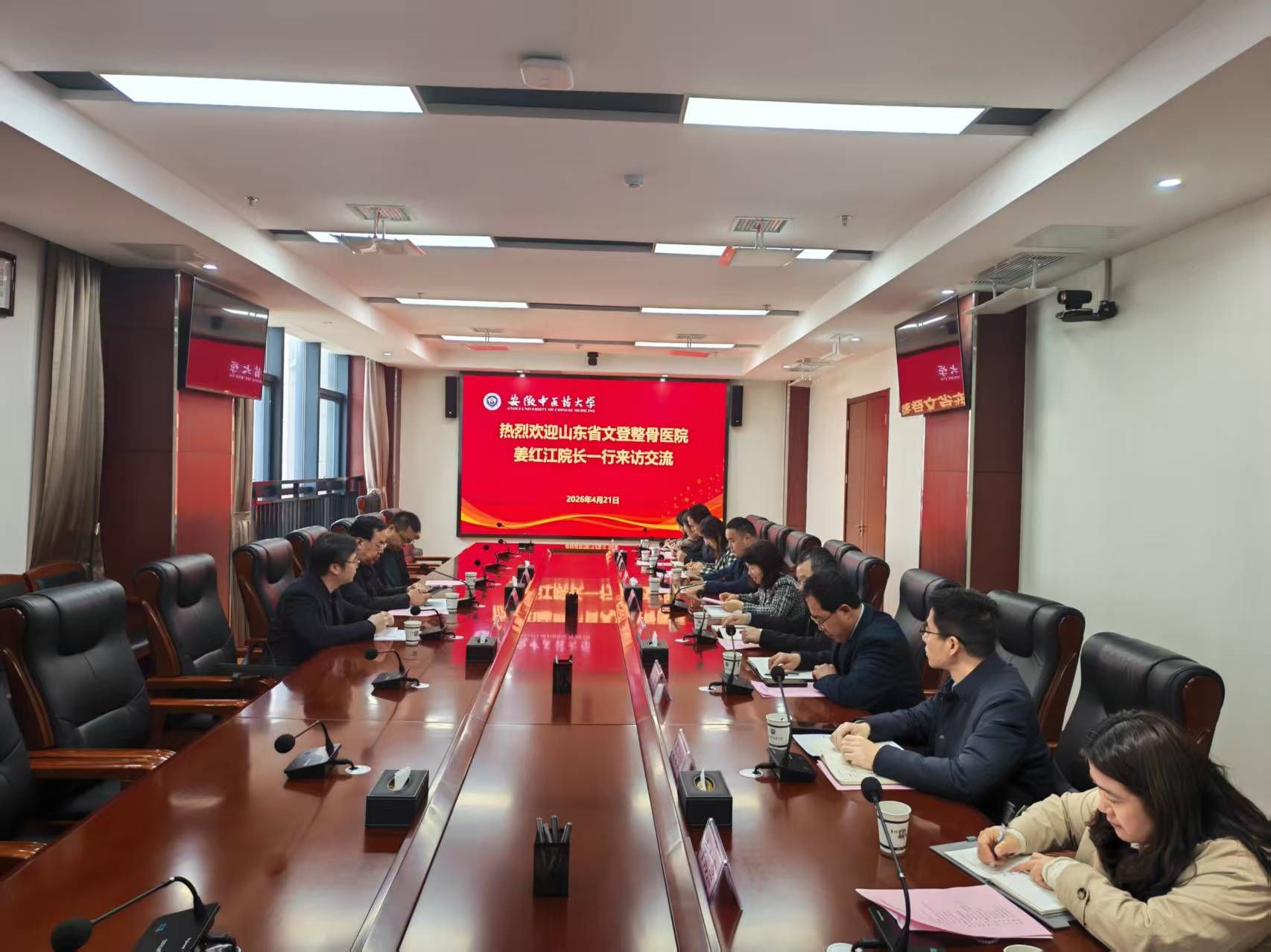 4月21日,山东省文登整骨医院院长姜红江率队来校调研并就本科生实践教学、研究生联合培养等方面进行交流。座谈会前,校党委书记谢瑞瑾会见姜红江一行。学校党委常委、副校长桂双英出席会议,教务处、学生处、研究生院、针灸推拿学院等部门负责人参会。