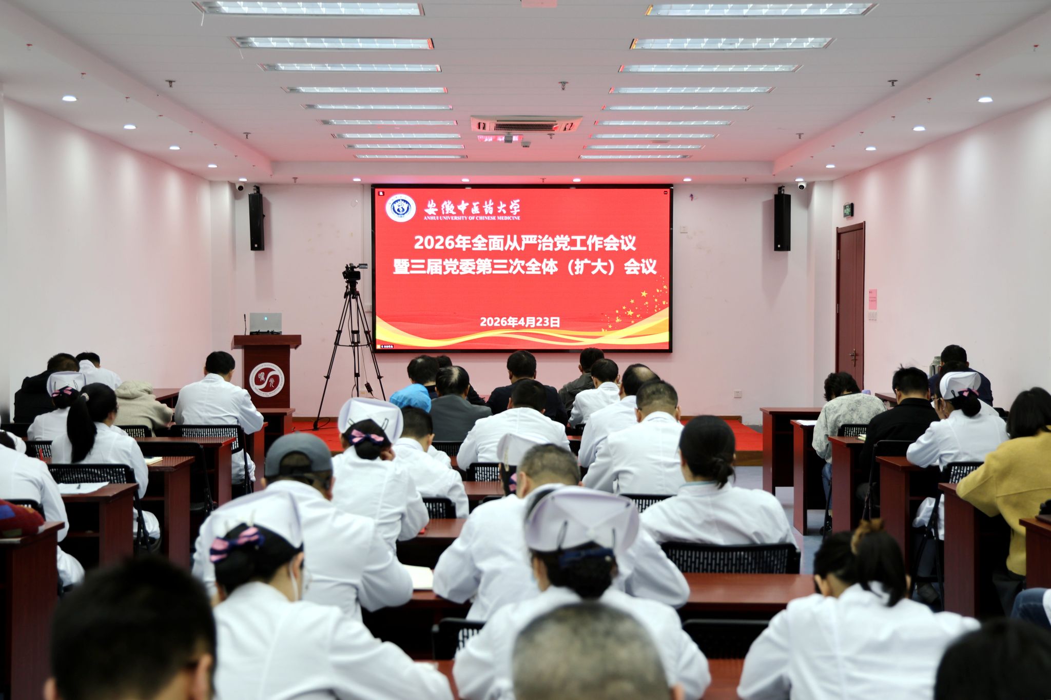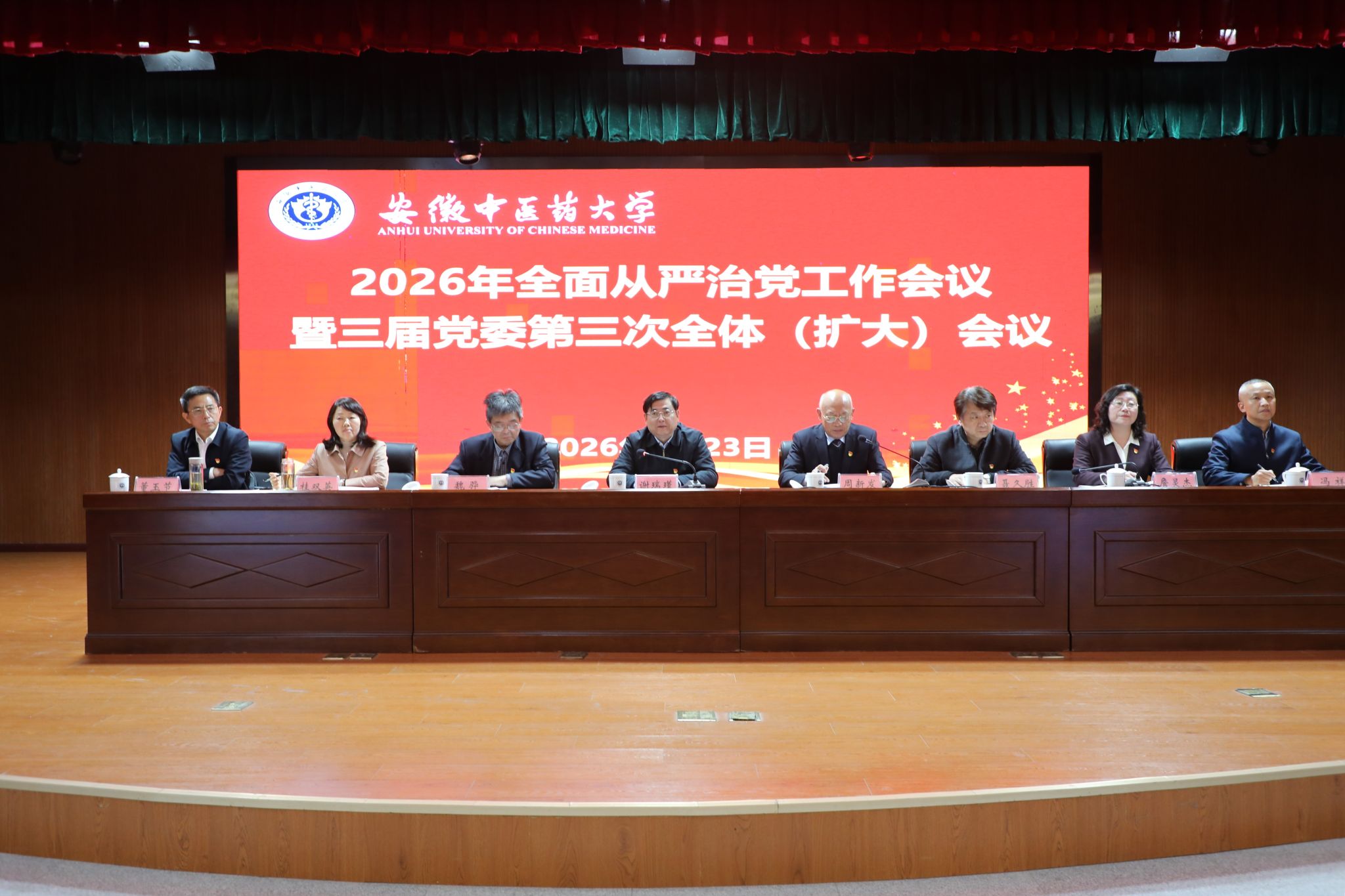 4月23日下午,学校召开2026年全面从严治党工作会议暨三届党委第三次全体(扩大)会议。校党委书记谢瑞瑾出席会议并讲话,校党委副书记周新发主持会议。在校校领导魏骅、聂久胜、桂双英、詹灵杰以及党委常委董玉节、冯祥出席会议。