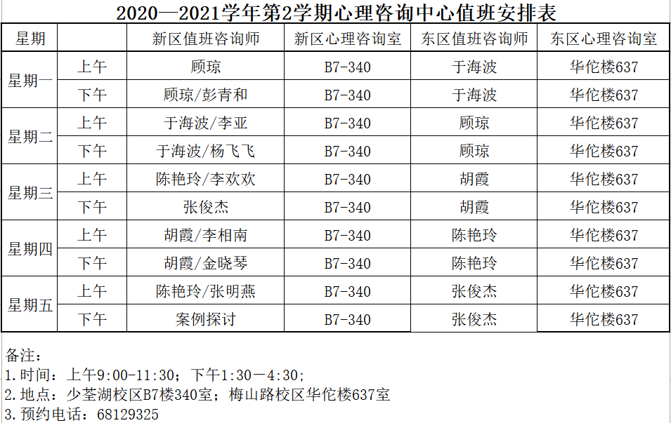 本学期心理咨询中心日常约访工作已经正式开始,欢迎广大在校师生预约来访(少荃湖校区、梅山路校区同时进行)。值班安排如下: