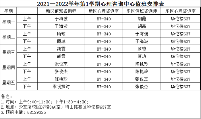 本学期心理咨询中心日常约访工作已经正式开始,欢迎广大在校师生预约来访(少荃湖校区、梅山路校区同时进行)。值班安排如下: