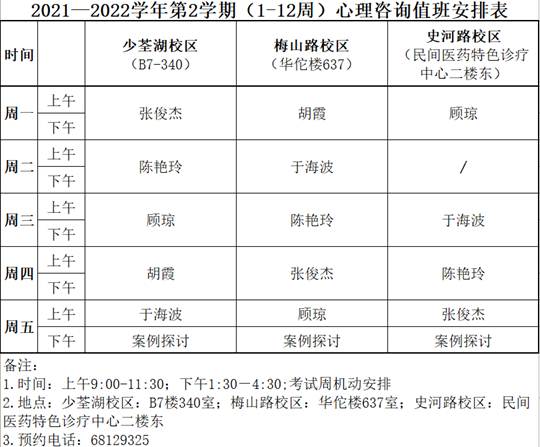 以下是本学期1-12周心理咨询中心值班安排表,欢迎广大在校师生预约来访(少荃湖校区、梅山路校区、史河路校区同时进行)。值班安排如下: